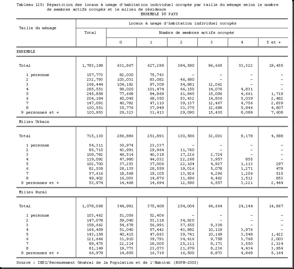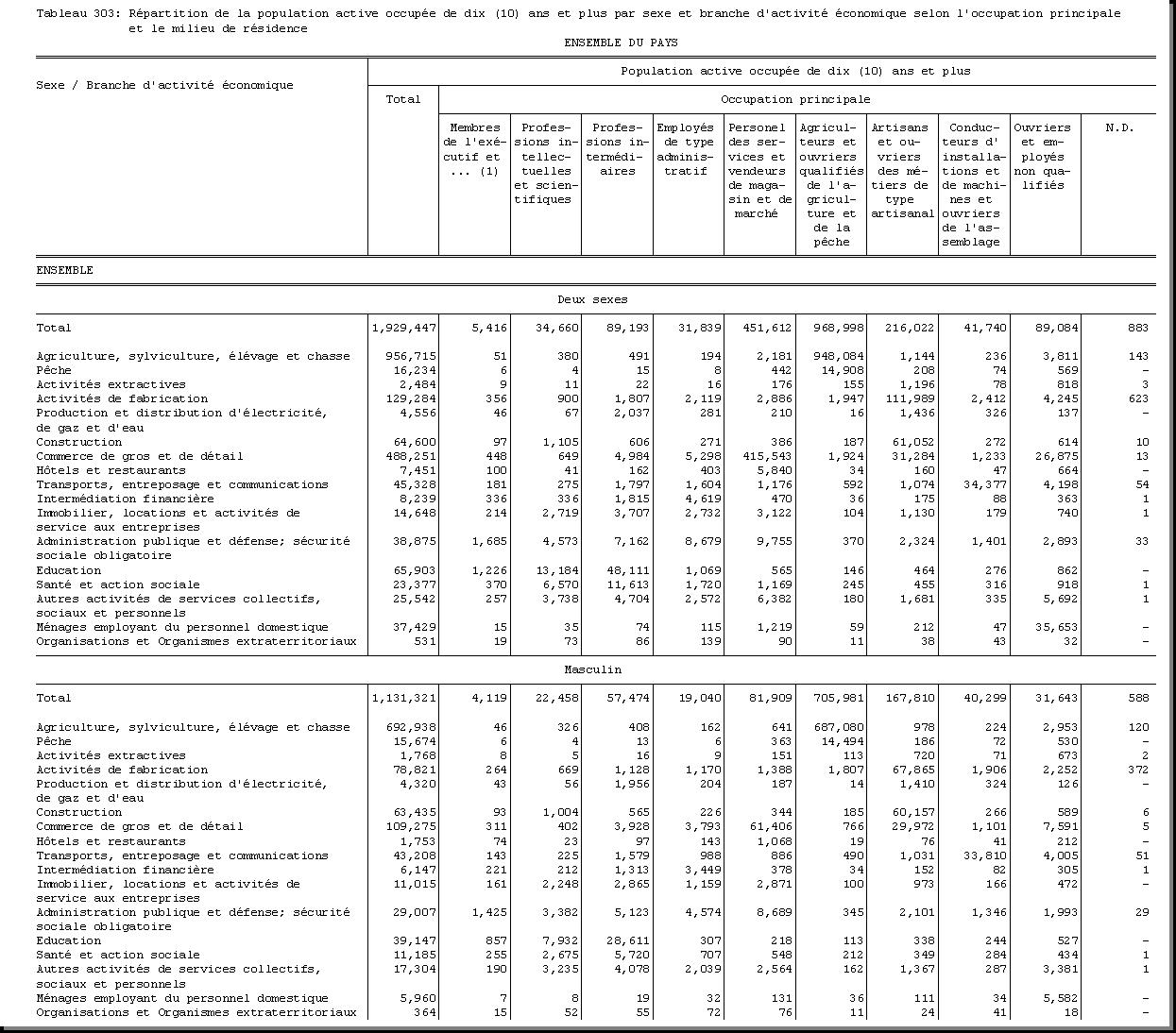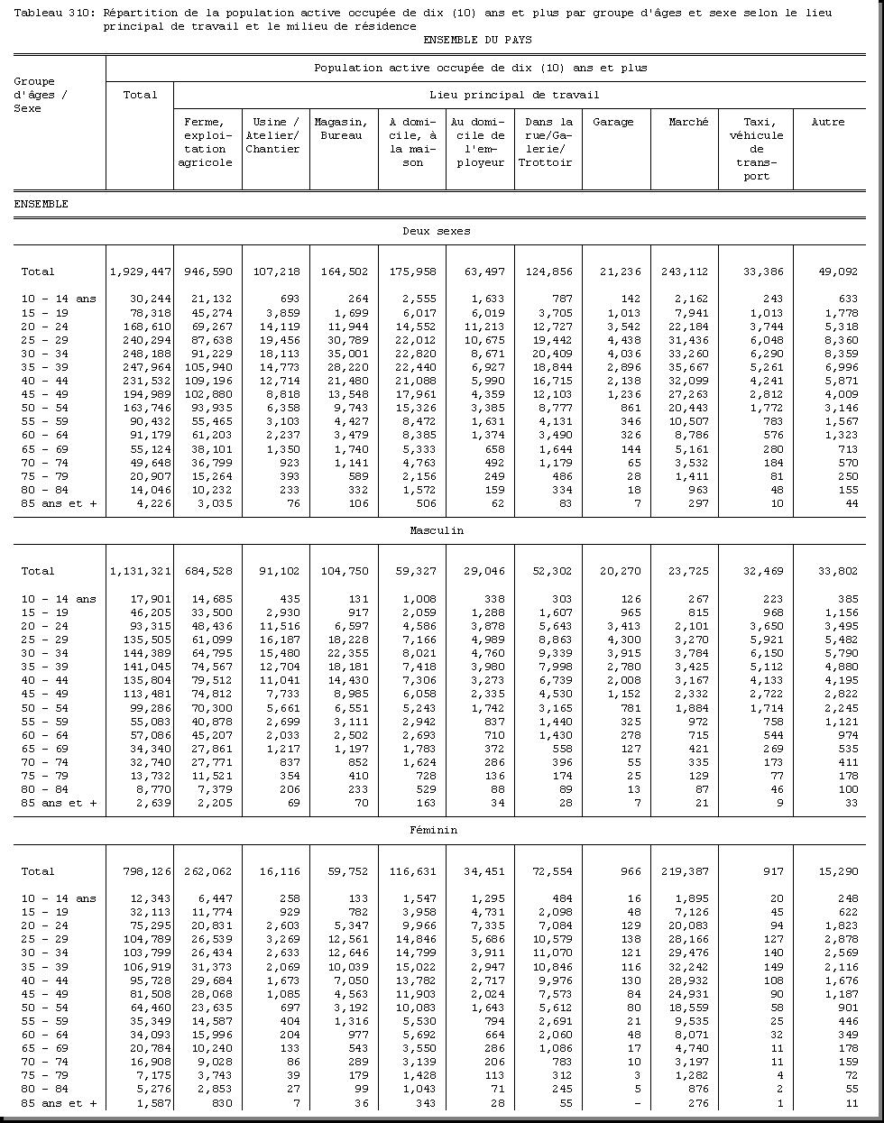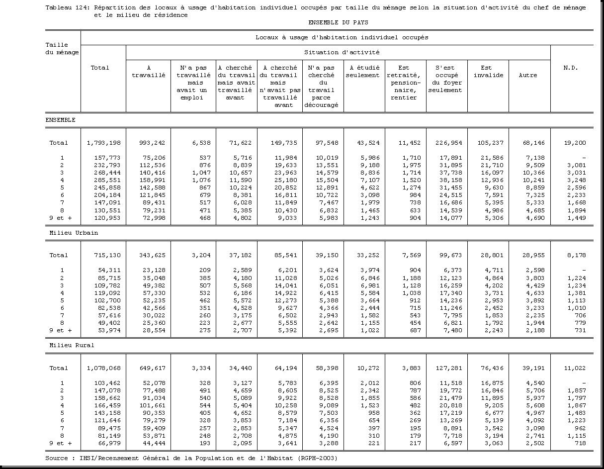 SEXE : F1.4, CHEF DE MENAGE : F1.3.1, OCCUPATION PRINCIPALE : F3.25, POPULATION ACTIVE OCCUPEE : F3.22.1/F3.22.2, TAILLE DU MENAGE : D21, MILIEU DE RESIDENCE : A4 |