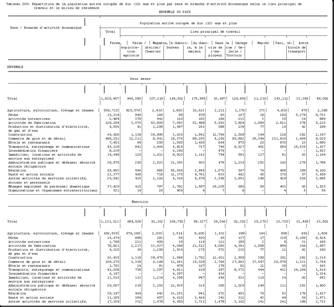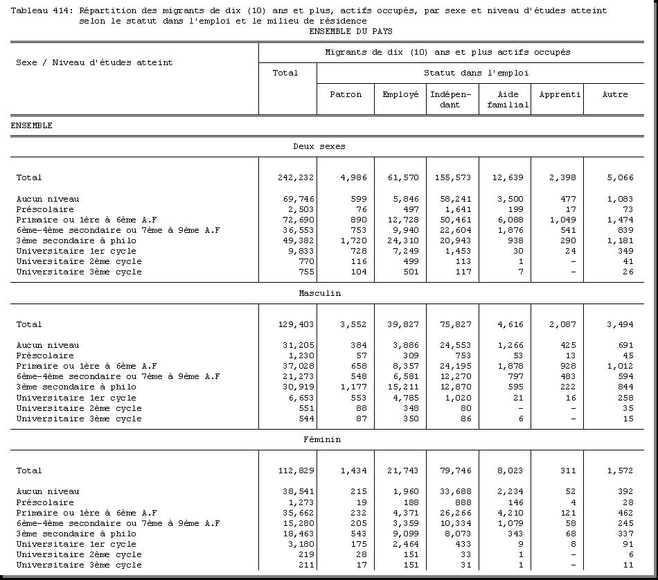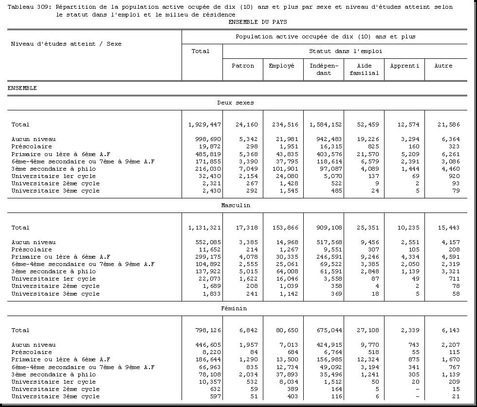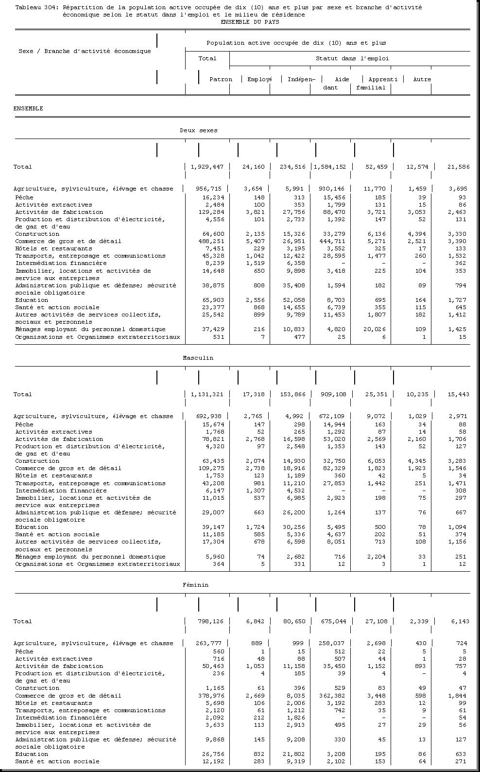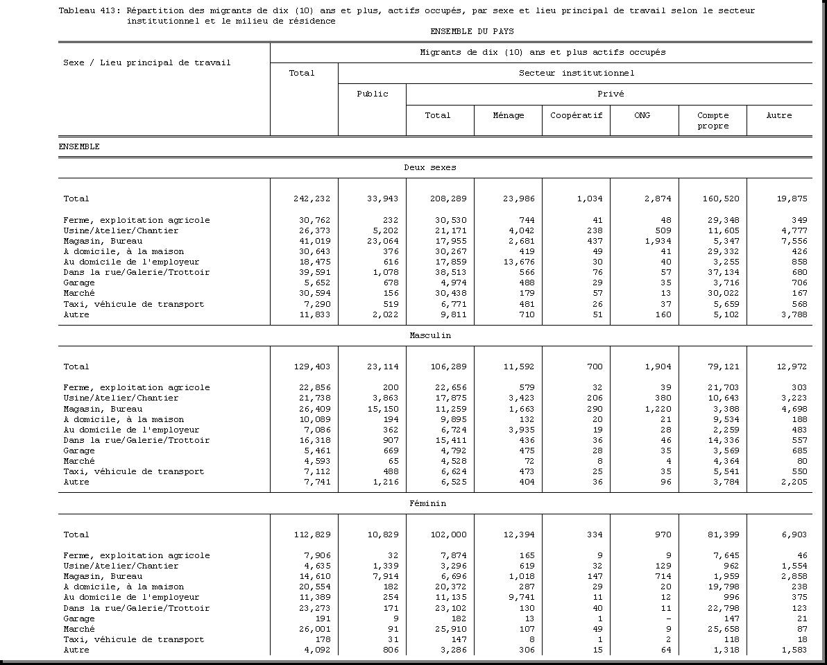 SEXE : F1.4, CHEF DE MENAGE : F1.3.1, OCCUPATION PRINCIPALE : F3.25, POPULATION ACTIVE OCCUPEE : F3.22.1/F3.22.2, TAILLE DU MENAGE : D21, MILIEU DE RESIDENCE : A4 |
