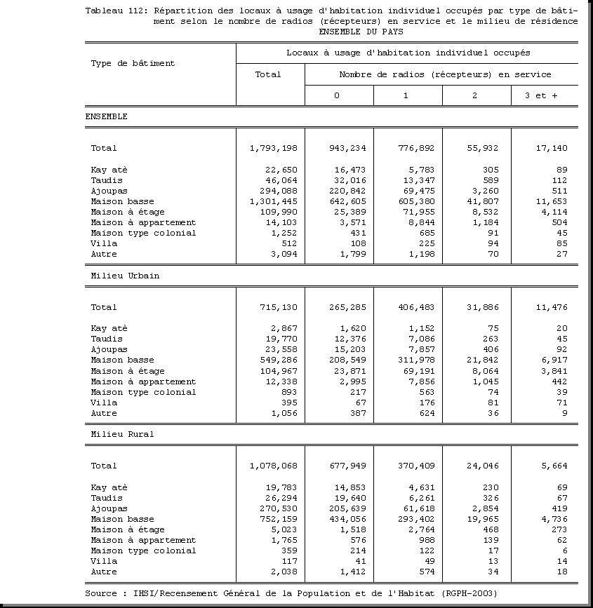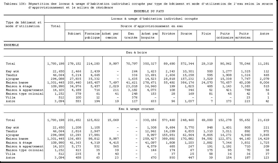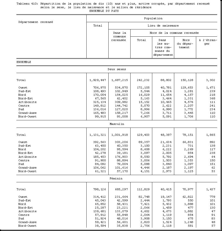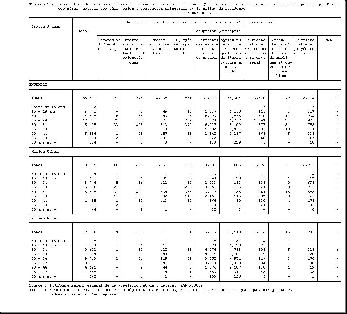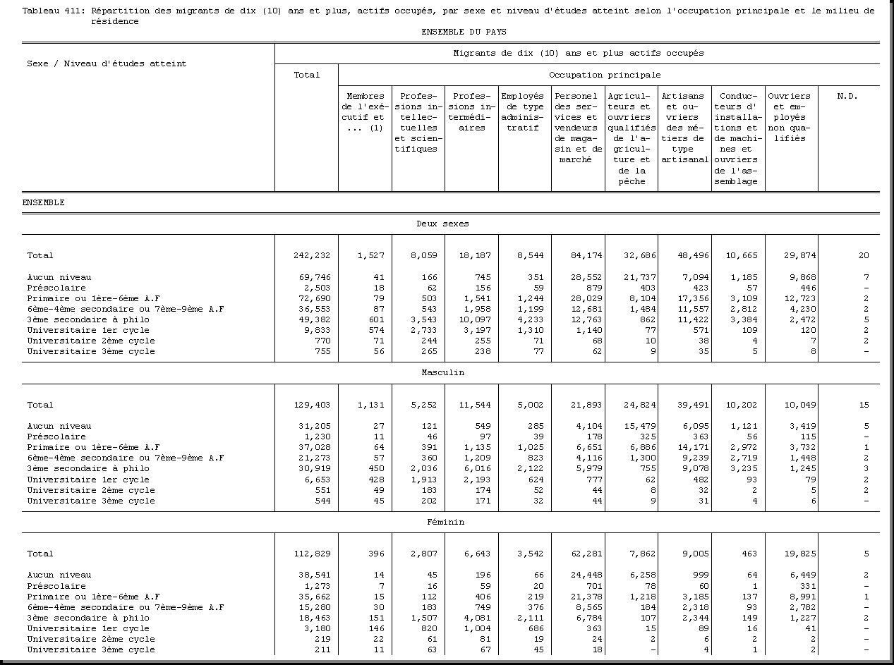SEXE : F1.4, CHEF DE MENAGE : F1.3.1, OCCUPATION PRINCIPALE : F3.25, POPULATION ACTIVE OCCUPEE : F3.22.1/F3.22.2, TAILLE DU MENAGE : D21, MILIEU DE RESIDENCE : A4 |