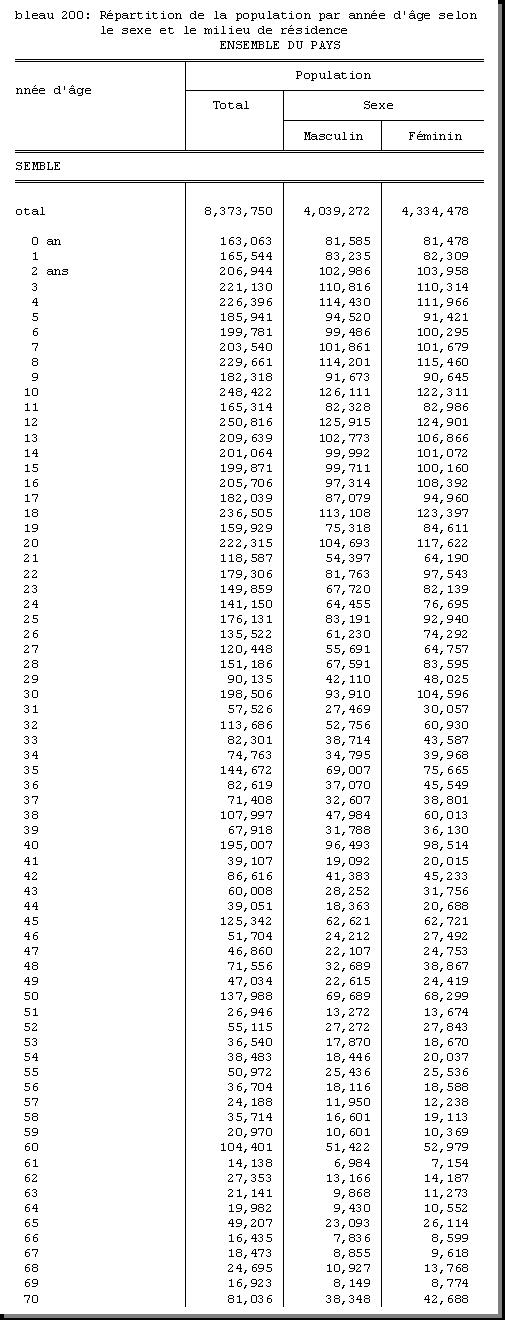 TAB-200 : REPARTITION DE LA POPULATION PAR AGE SELON LE SEXE ET LE MILIEU DE RESIDENCE |