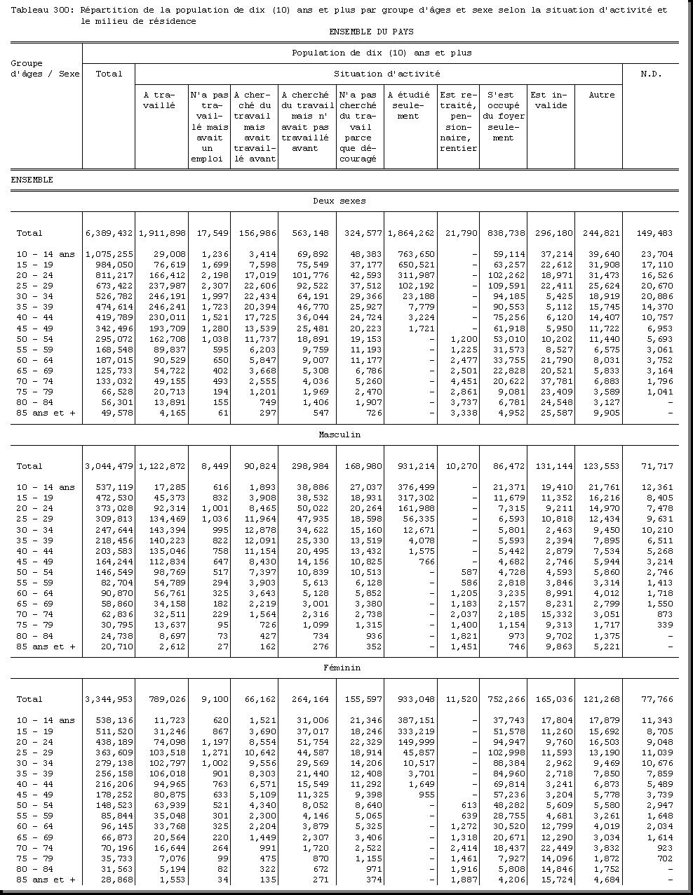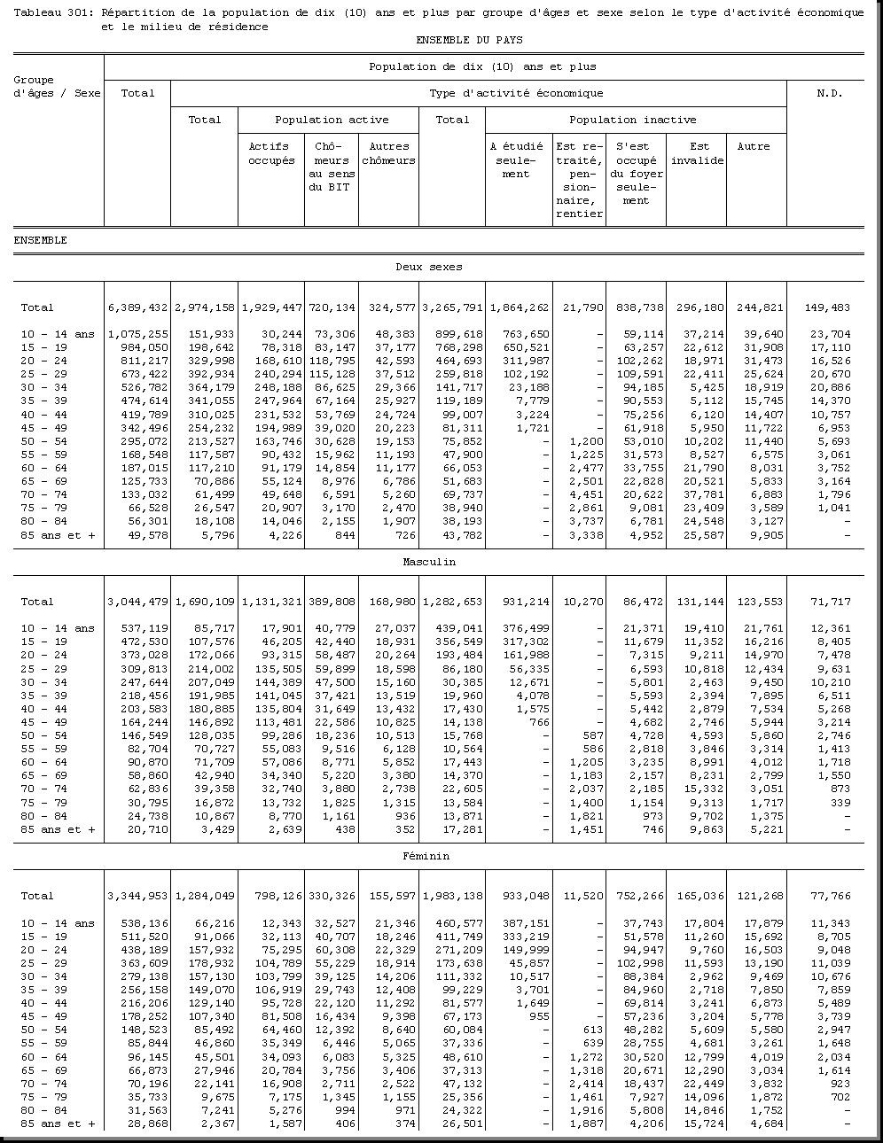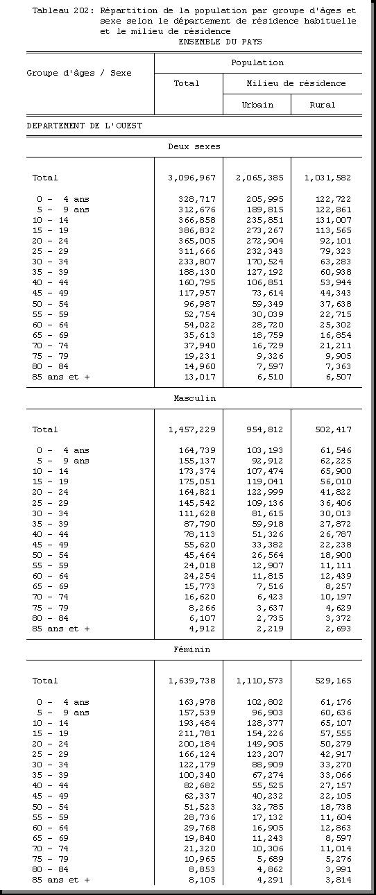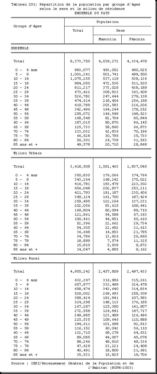 TAB-201 : REPARTITION DE LA POPULATION PAR GROUPE D'AGES SELON LE SEXE ET LE MILIEU DE RESIDENCE |
