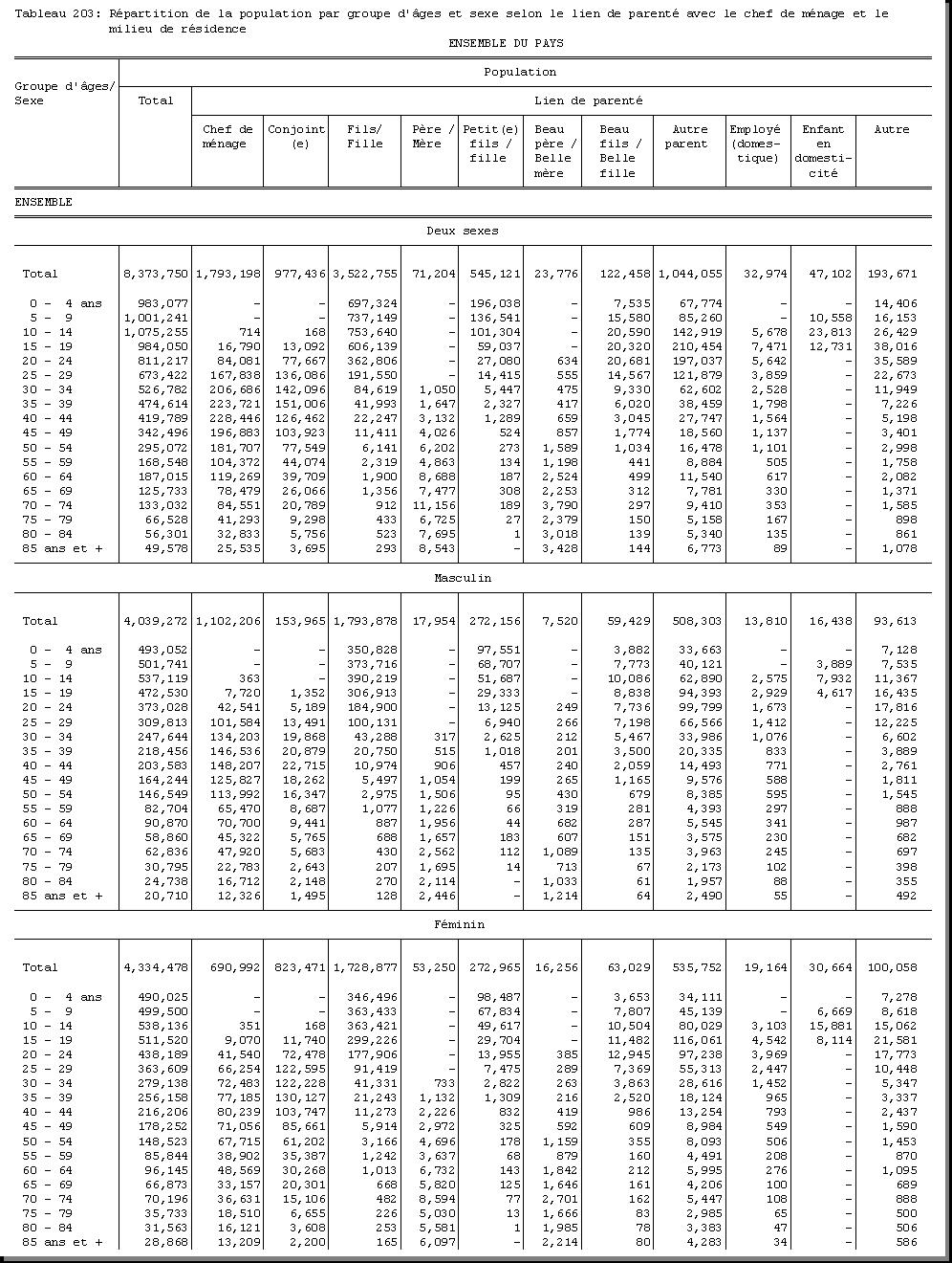 TAB-203 : REPARTITION DE LA POPULATION PAR GROUPE D'AGES ET SEXE SELON LE LIEN DE PARENTE AVEC LE CHEF DE MENAGE ET LE MILIEU DE RESIDENCE |