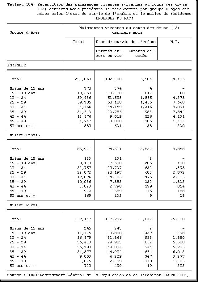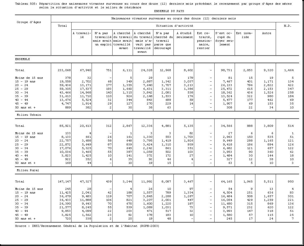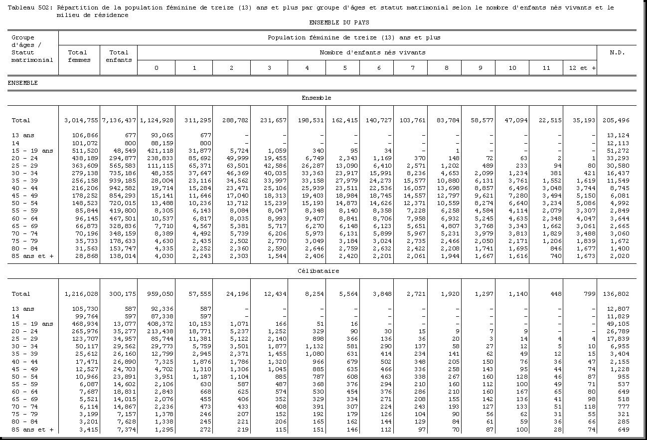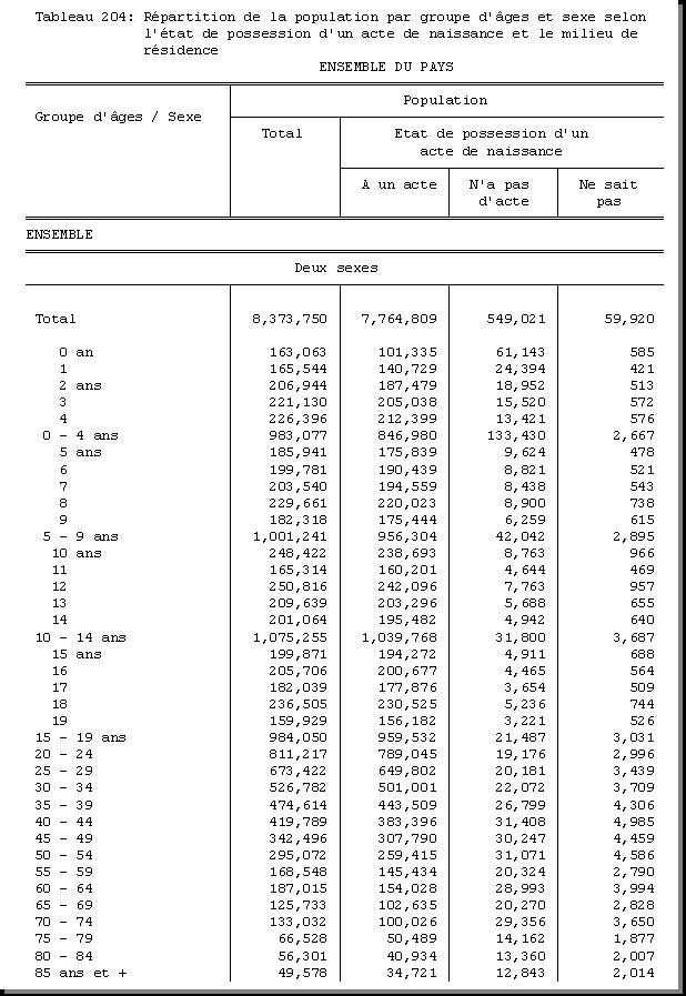 TAB-204 : REPARTITION DE LA POPULATION PAR GROUPE D'AGES ET SEXE SELON L'ETAT DE POSSESSION D'UN ACTE DE NAISSANCE ET LE MILIEU DE RESIDENCE |