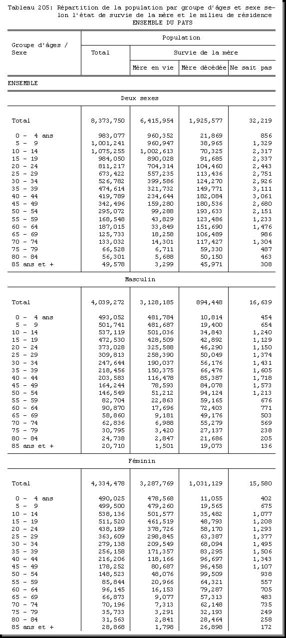TAB-205 : REPARTITION DE LA POPULATION PAR GROUPE D'AGES ET SEXE SELON L'ETAT DE SURVIE DE LA MERE ET LE MILIEU DE RESIDENCE |