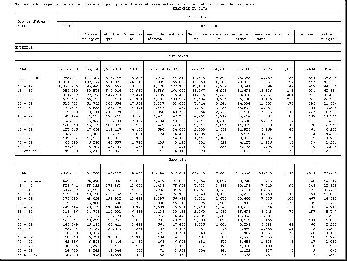 TAB-206 : REPARTITION DE LA POPULATION PAR GROUPE D'AGES ET SEXE SELON LA RELIGION ET LE MILIEU DE RESIDENCE |