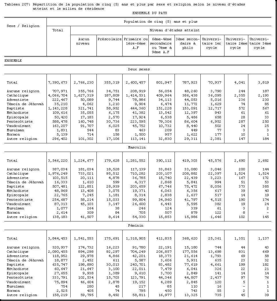 TAB-207 : REPARTITION DE LA POPULATION DE CINQ (5) ANS ET PLUS PAR SEXE ET RELIGION SELON LE NIVEAU D'ETUDES ATTEINT ET LE MILIEU DE RESIDENCE |