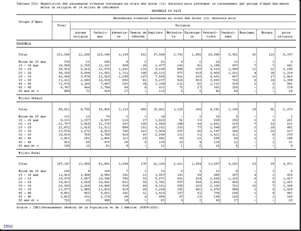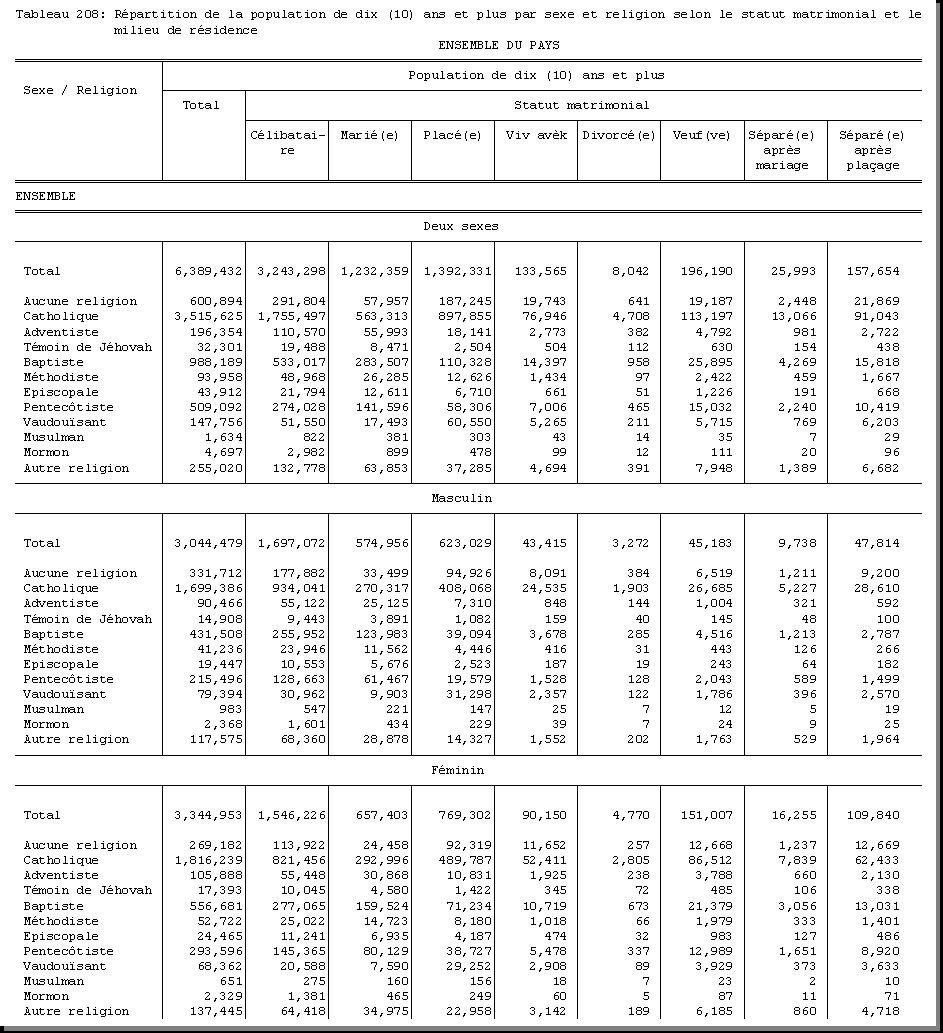 TAB-208 : REPARTITION DE LA POPULATION DE DIX (10) ANS ET PLUS PAR SEXE ET RELIGION SELON LE STATUT MATRIMONIAL ET LE MILIEU DE RESIDENCE |