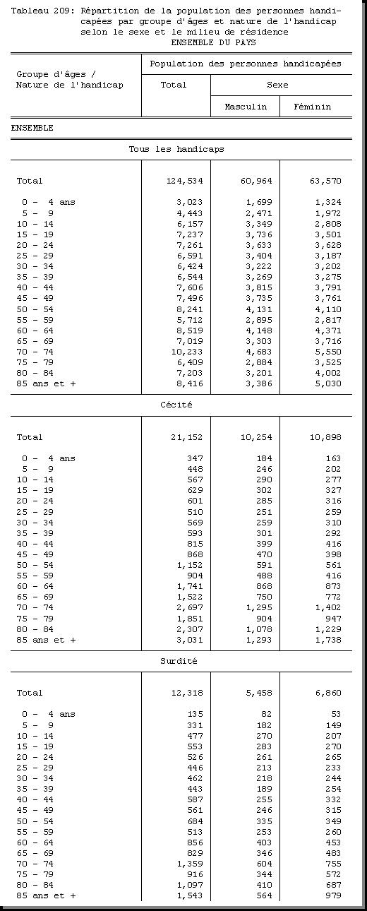 TAB-209 : REPARTITION DE LA POPULATION DES PERSONNES HANDICAPEES PAR GROUPE D'AGES ET NATURE DE L'HANDICAP SELON LE SEXE ET LE MILIEU DE RESIDENCE |