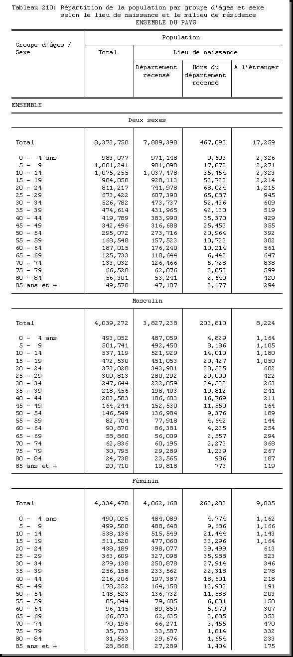 TAB-210 : REPARTITION DE LA POPULATION PAR GROUPE D'AGES ET SEXE SELON LE LIEU DE NAISSANCE ET LE MILIEU DE RESIDENCE |