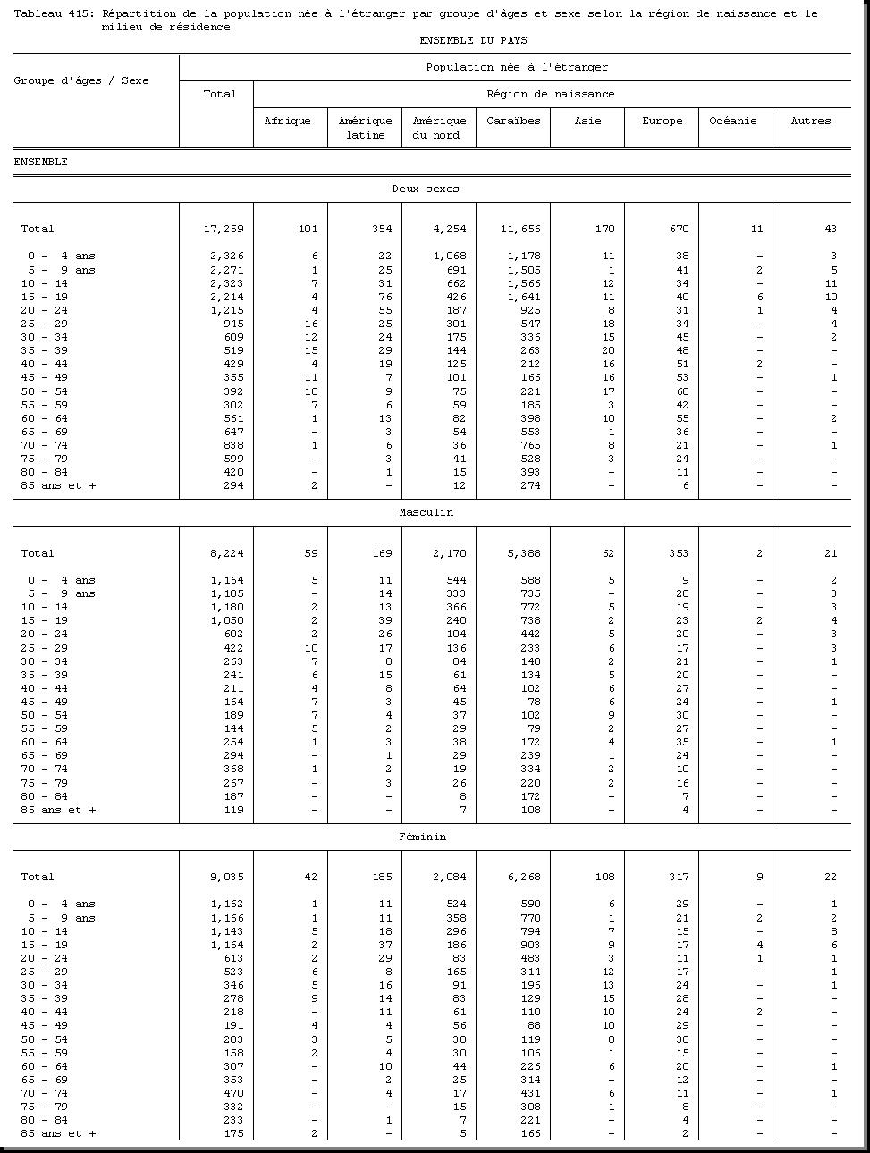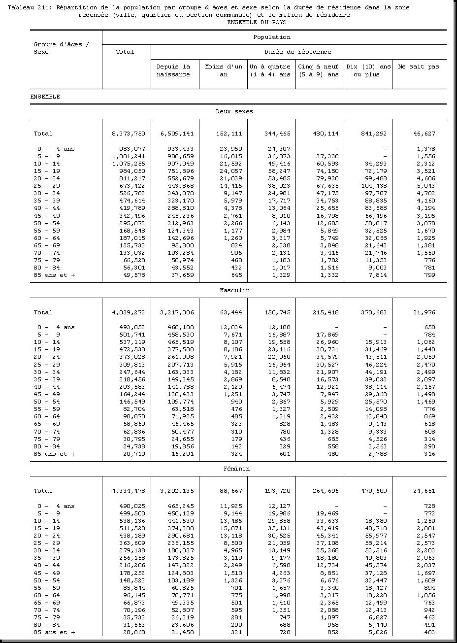 TAB-211 : REPARTITION DE LA POPULATION PAR GROUPE D'AGES ET SEXE SELON LA DUREE DE RESIDENCE DANS LA ZONE RECENSEE (VILLE, QUARTIER OU SECTION COMMUNALE) ET LE MILIEU DE RESIDENCE |