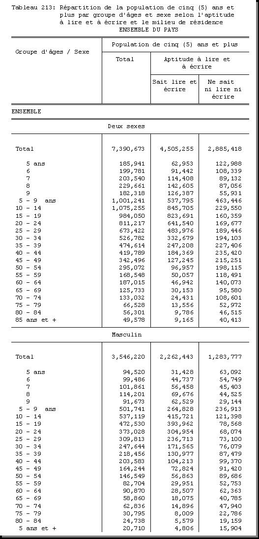 TAB-213 : REPARTITION DE LA POPULATION DE CINQ (5) ANS ET PLUS PAR GROUPE D'AGES ET SEXE SELON L'APTITUDE A LIRE ET A ECRIRE ET LE MILIEU DE RESIDENCE |