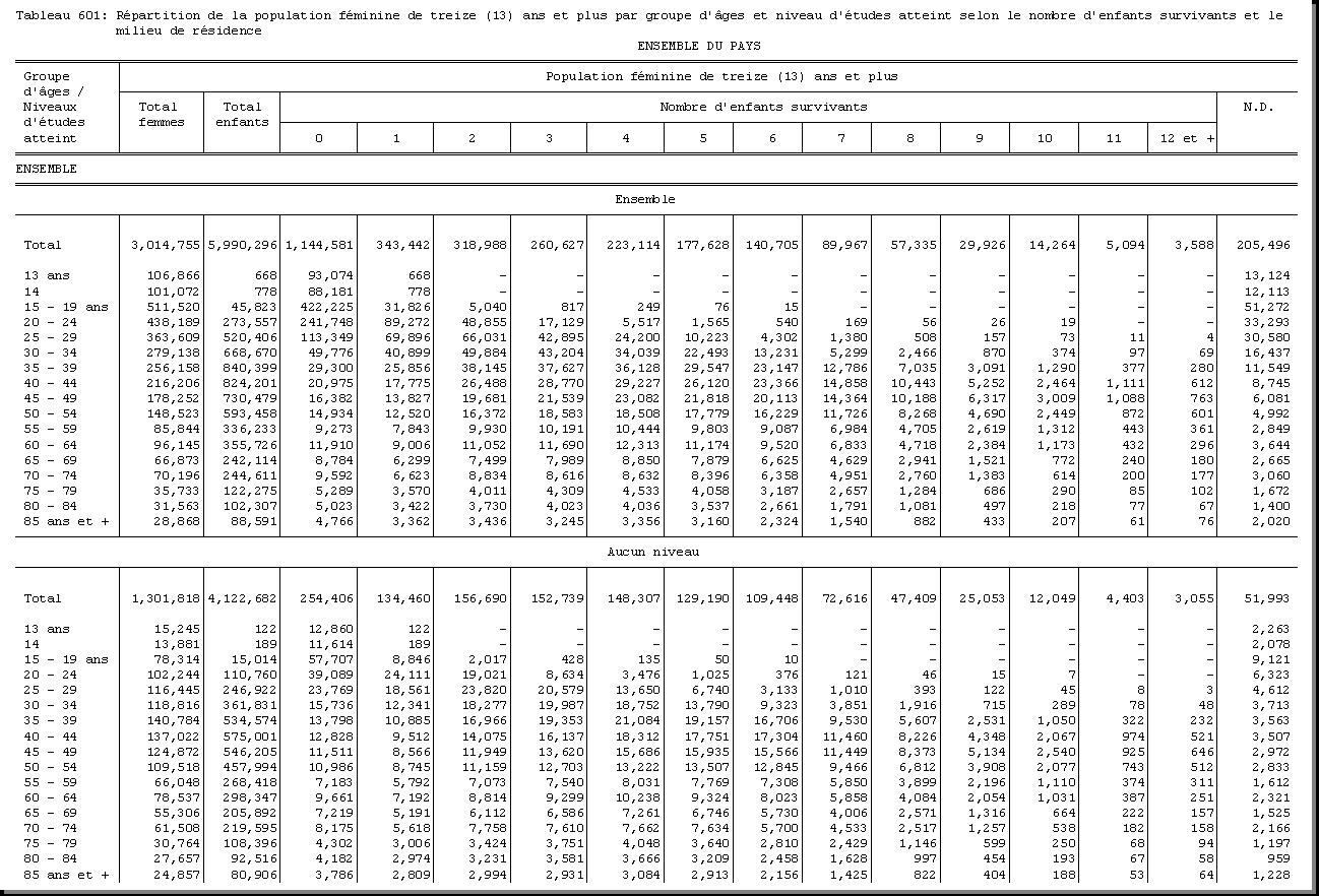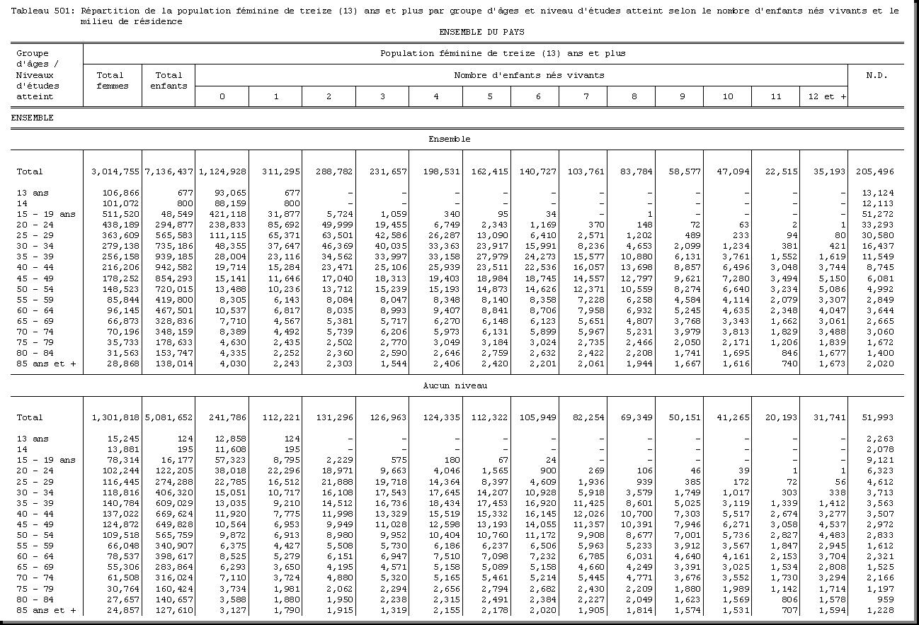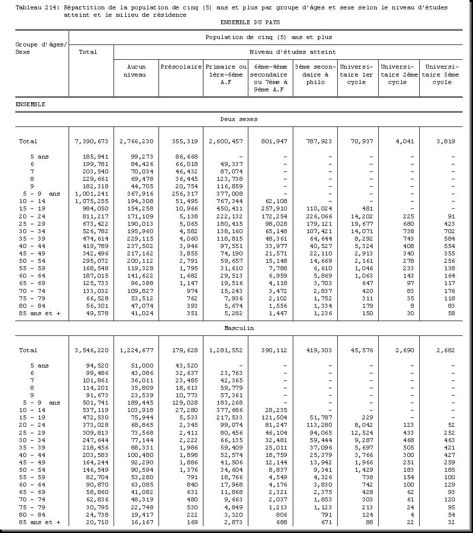 TAB-214 : REPARTITION DE LA POPULATION DE CINQ (5) ANS ET PLUS PAR GROUPE D'AGES ET SEXE SELON LE NIVEAU D'ETUDES ATTEINT ET LE MILIEU DE RESIDENCE |