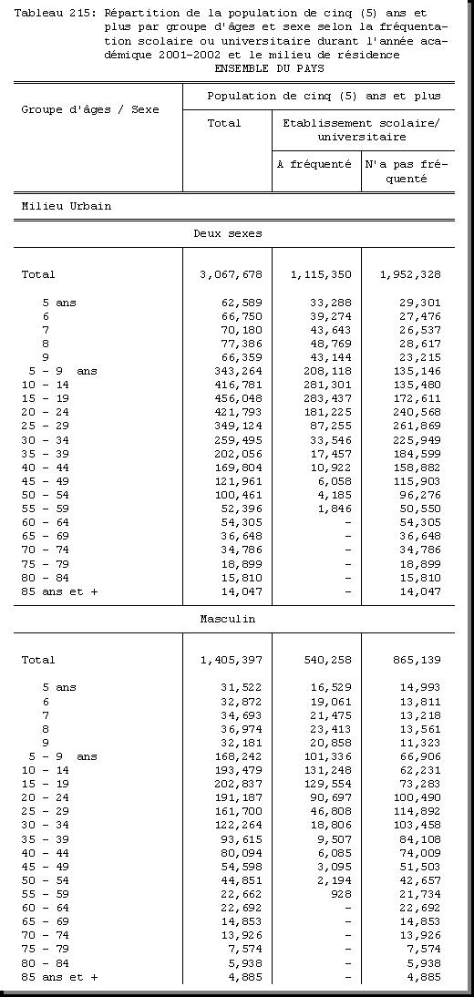 TAB-215 : REPARTITION DE LA POPULATION DE CINQ (5) ANS ET PLUS PAR GROUPE D'AGES ET SEXE SELON LA FREQUENTATION SCOLAIRE OU UNIVERSITAIRE DURANT L'ANNEE ACADEMIQUE 2001 - 2002 ET LE MILIEU DE RESIDENCE |