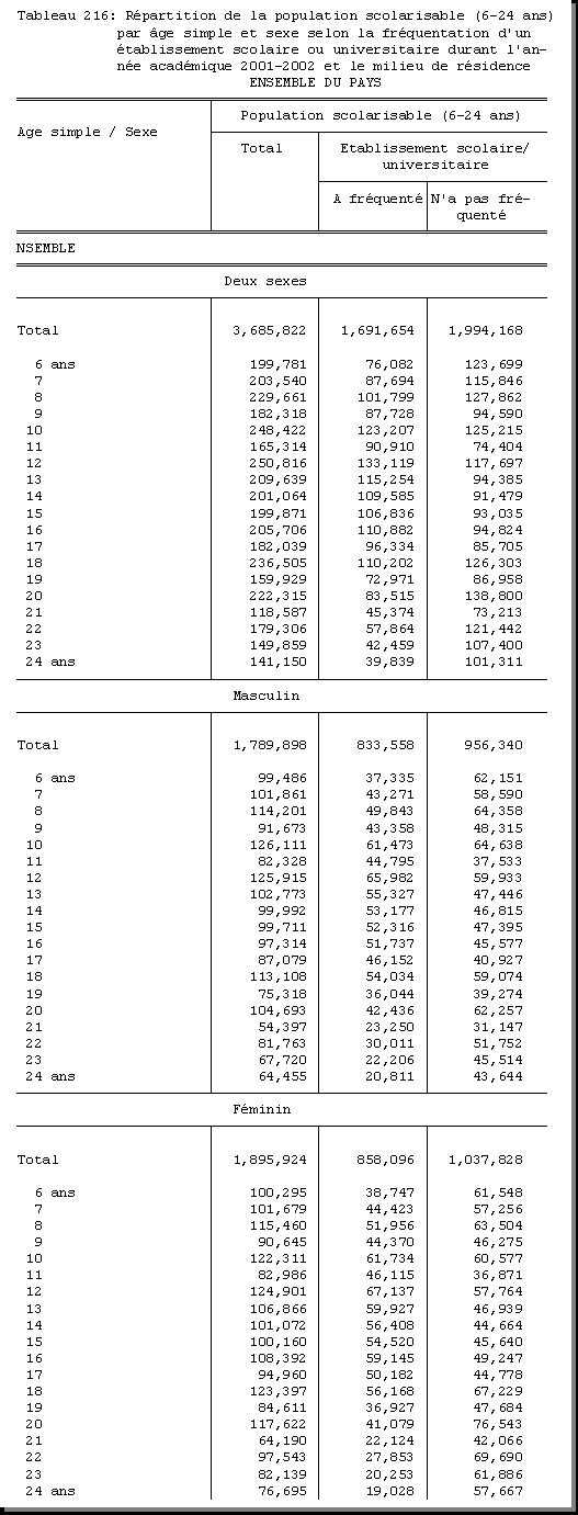 TAB-216 : REPARTITION DE LA POPULATION SCOLARISABLE (6-24 ANS) PAR AGE SIMPLE ET SEXE SELON LA FREQUENTATION D'UN ETABLISSEMENT SCOLAIRE OU UNIVERSITAIRE DURANT L'ANNEE ACADEMIQUE 2001 - 2002 ET LE MILIEU DE RESIDENCE |