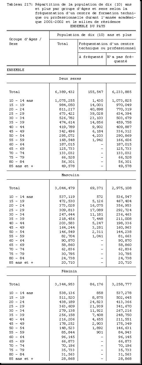 TAB-217 : REPARTITION DE LA POPULATION DE 10 ANS ET PLUS PAR GROUPE D'AGES ET SEXE SELON LA FREQUENTATION D'UN CENTRE DE FORMATION TECHNIQUE OU PROFESSIONNELLE DURANT L'ANNEE ACADEMIQUE 2001 - 2002 ET LE MILIEU DE RESIDENCE |