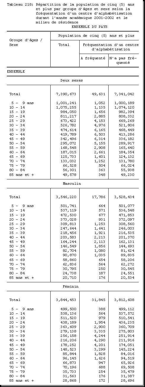 TAB-218 : REPARTITION DE LA POPULATION DE CINQ (5) ANS ET PLUS PAR GROUPE D'AGES ET SEXE SELON LA FREQUENTATION D'UN CENTRE D'ALPHABETISATION DURANT L'ANNEE ACADEMIQUE 2001 - 2002 ET LE MILIEU DE RESIDENCE |
