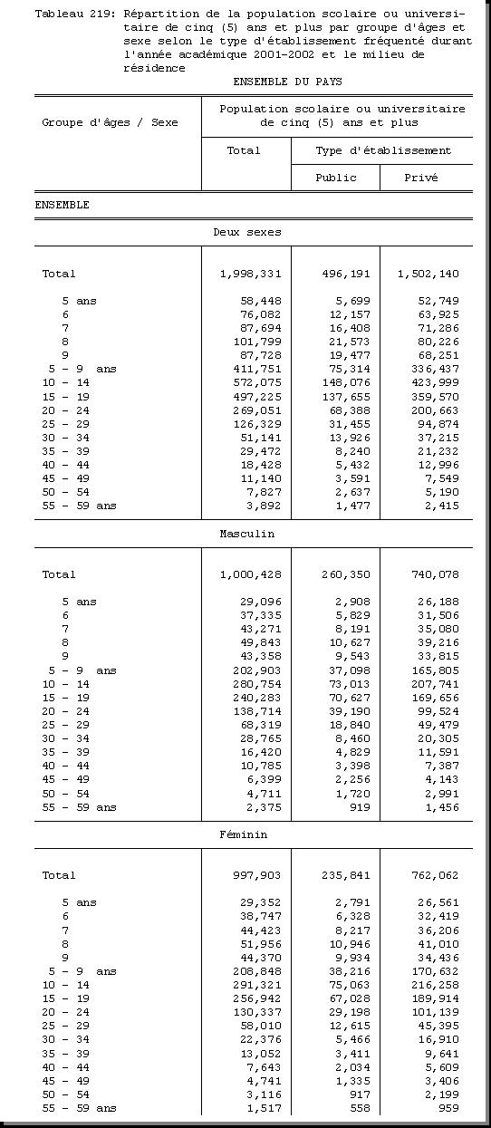 TAB-219 : REPARTITION DE LA POPULATION SCOLAIRE OU UNIVERSITAIRE DE CINQ (5) ANS ET PLUS PAR GROUPE D'AGES ET SEXE SELON LE TYPE D'ETABLISSEMENT FREQUENTE DURANT L'ANNEE ACADEMIQUE 2001 - 2002 ET LE MILIEU DE RESIDENCE |