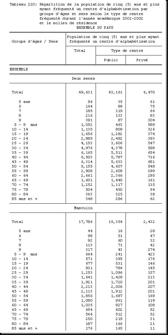 TAB-220 : REPARTITION DE LA POPULATION DE CINQ (5) ANS ET PLUS AYANT FREQUENTE UN CENTRE D'ALPHABETISATION PAR GROUPE D'AGES ET SEXE SELON LE TYPE DE CENTRE FREQUENTE DURANT L'ANNEE ACADEMIQUE 2001 - 2002 ET LE MILIEU DE RESIDENCE |