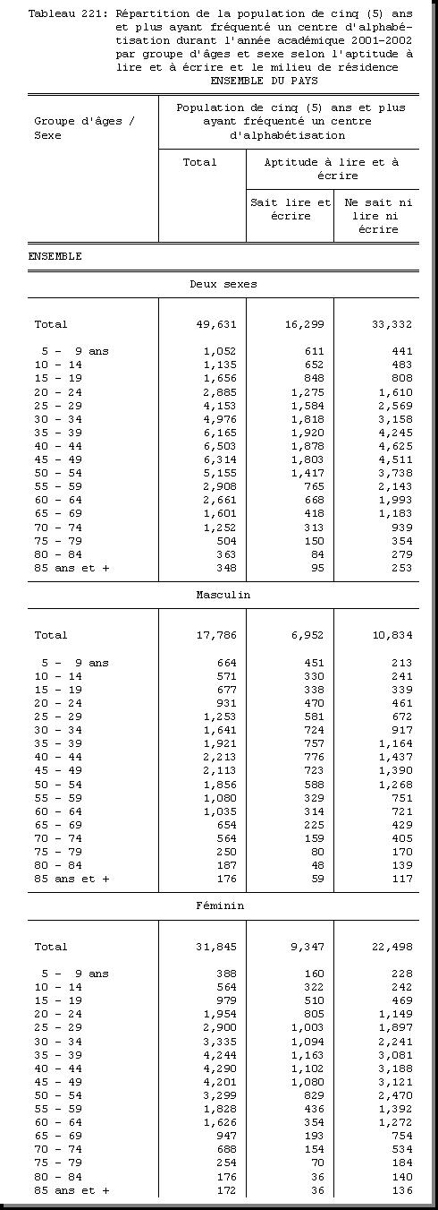 TAB-221 : REPARTITION DE LA POPULATION DE CINQ (5) ANS ET PLUS AYANT FREQUENTE UN CENTRE D'ALPHABETISATION DURANT L'ANNEE ACADEMIQUE 2001 - 2002 PAR GROUPE D'AGES ET SEXE SELON L'APTITUDE A LIRE ET A ECRIRE ET LE MILIEU DE RESIDENCE |