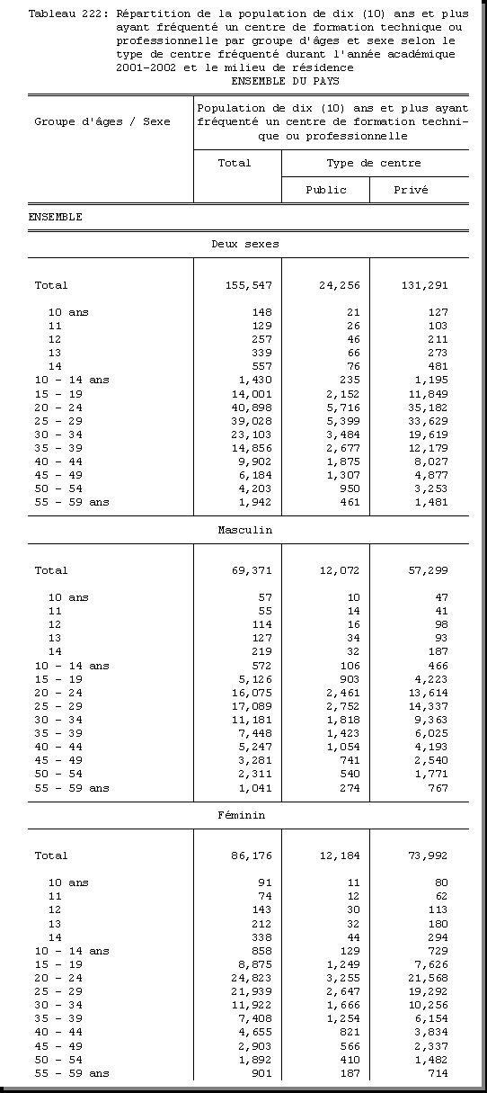 TAB-222 : REPARTITION DE LA POPULATION DE DIX (10) ANS ET PLUS AYANT FREQUENTE UN CENTRE DE FORMATION TECHNIQUE OU PROFESSIONNELLE PAR GROUPE D'AGES ET SEXE SELON LE TYPE DE CENTRE FREQUENTE DURANT L'ANNEE ACADEMIQUE 2001 - 2002 ET LE MILIEU DE RESIDENCE |