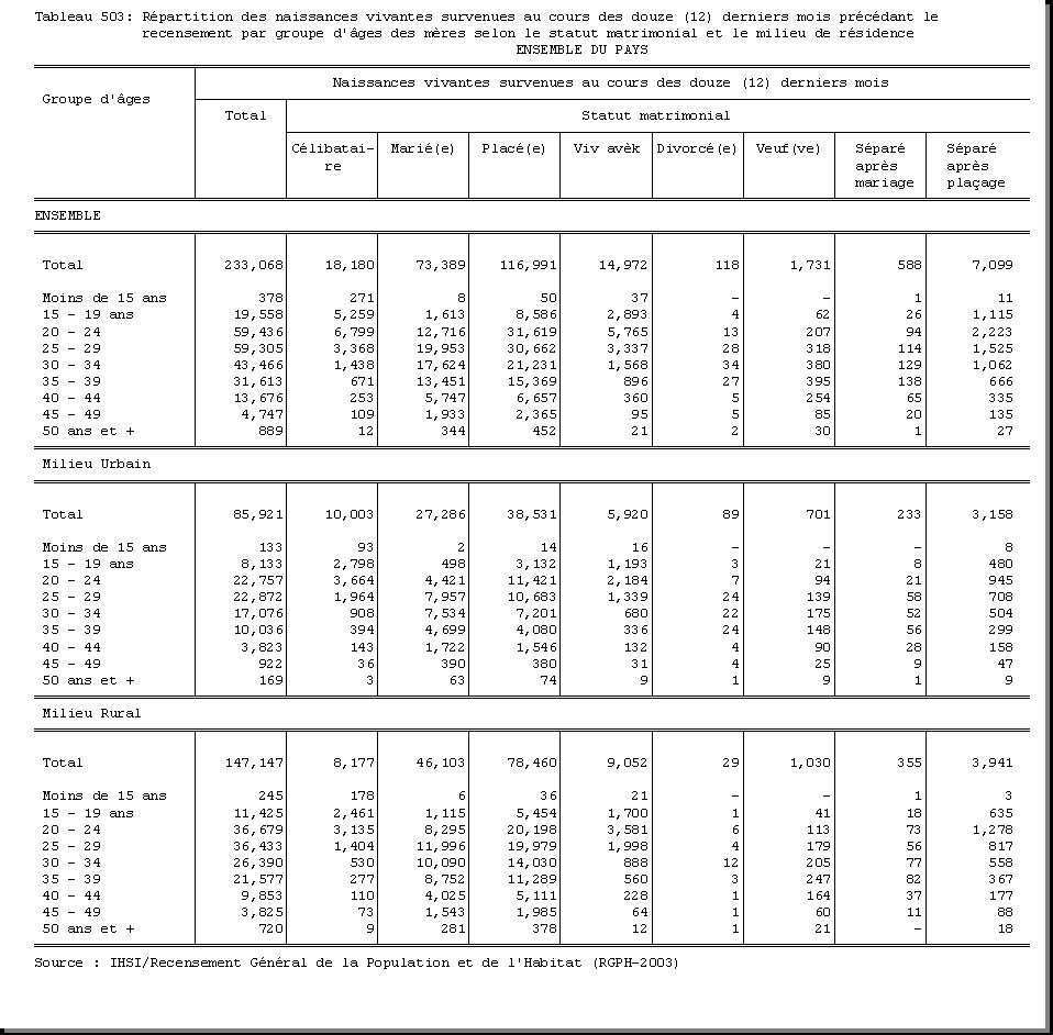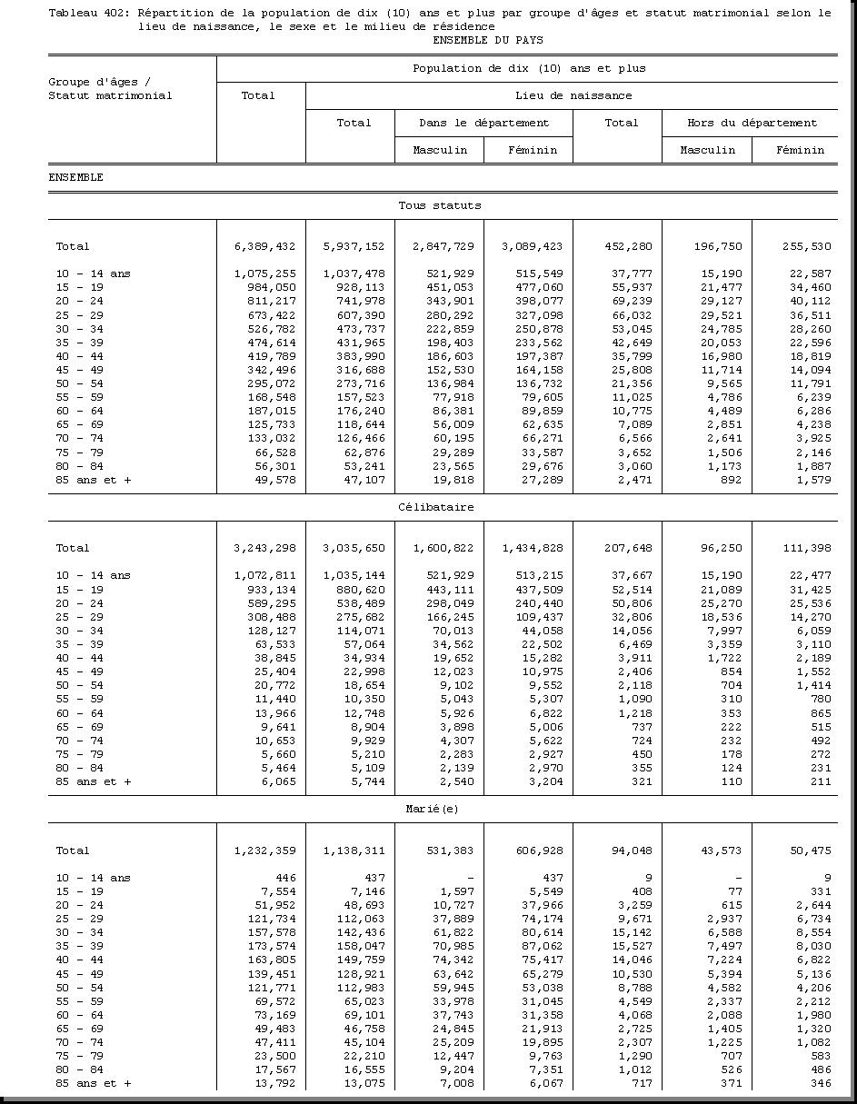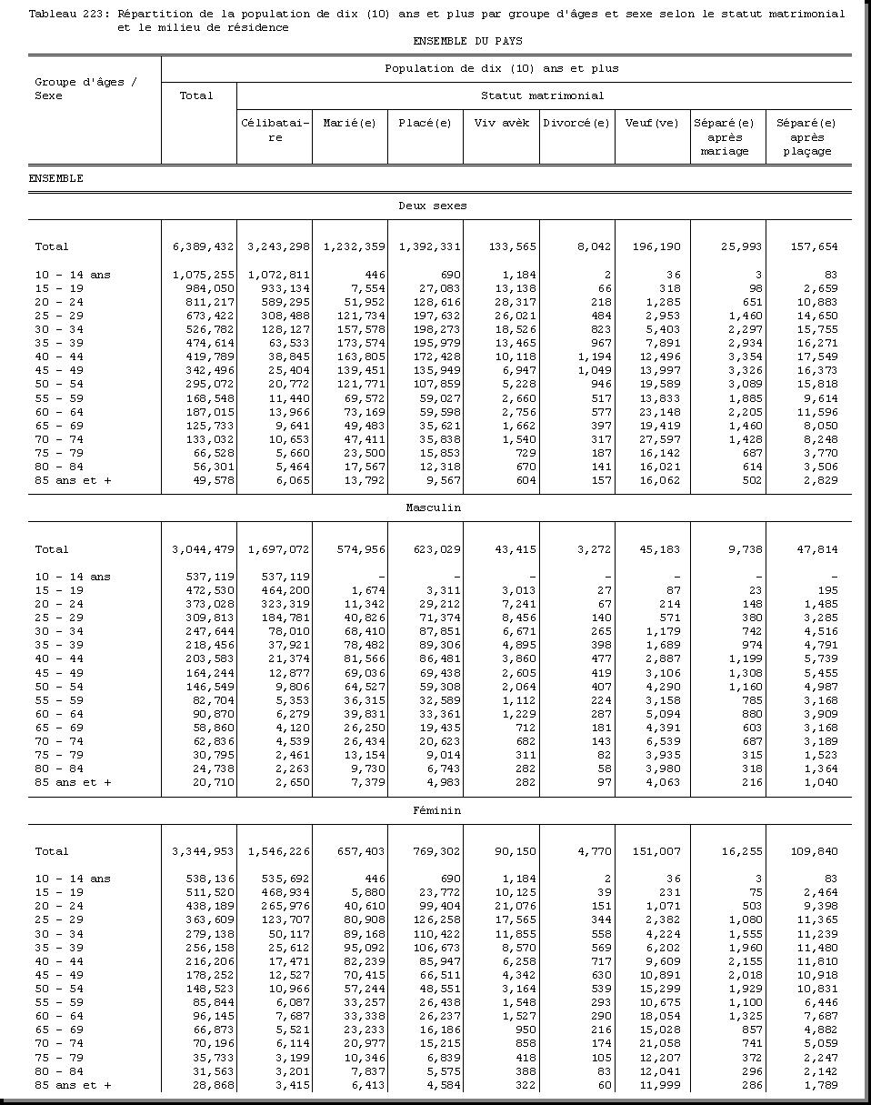 TAB-223 : REPARTITION DE LA POPULATION DE DIX (10) ANS ET PLUS PAR GROUPE D'AGES ET SEXE SELON LE STATUT MATRIMONIAL ET LE MILIEU DE RESIDENCE |