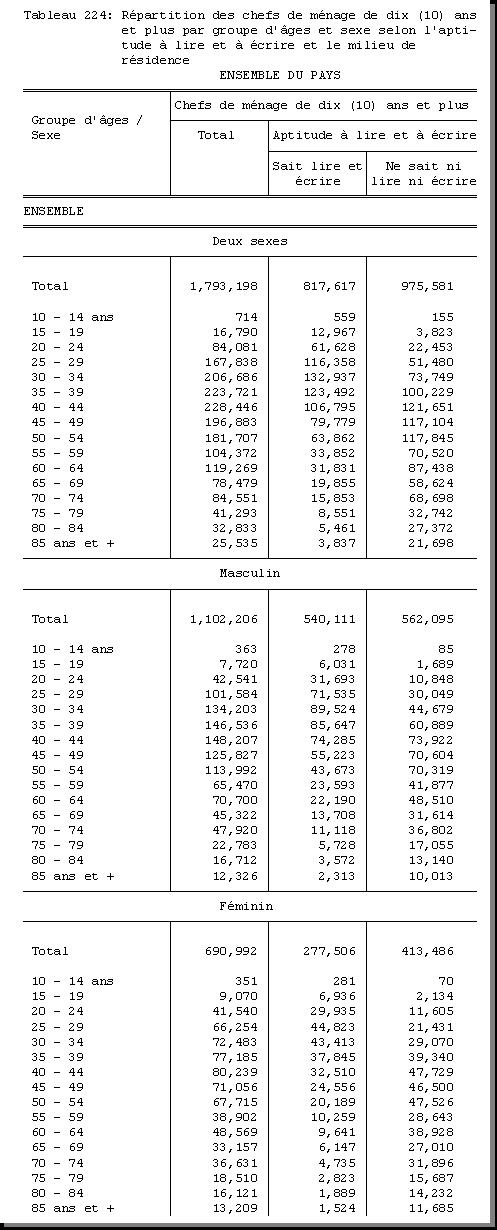 TAB-224 : REPARTITION DES CHEFS DE MENAGE DE DIX (10) ANS ET PLUS PAR GROUPE D'AGES ET SEXE SELON L'APTITUDE A LIRE ET A ECRIRE ET LE MILIEU DE RESIDENCE |