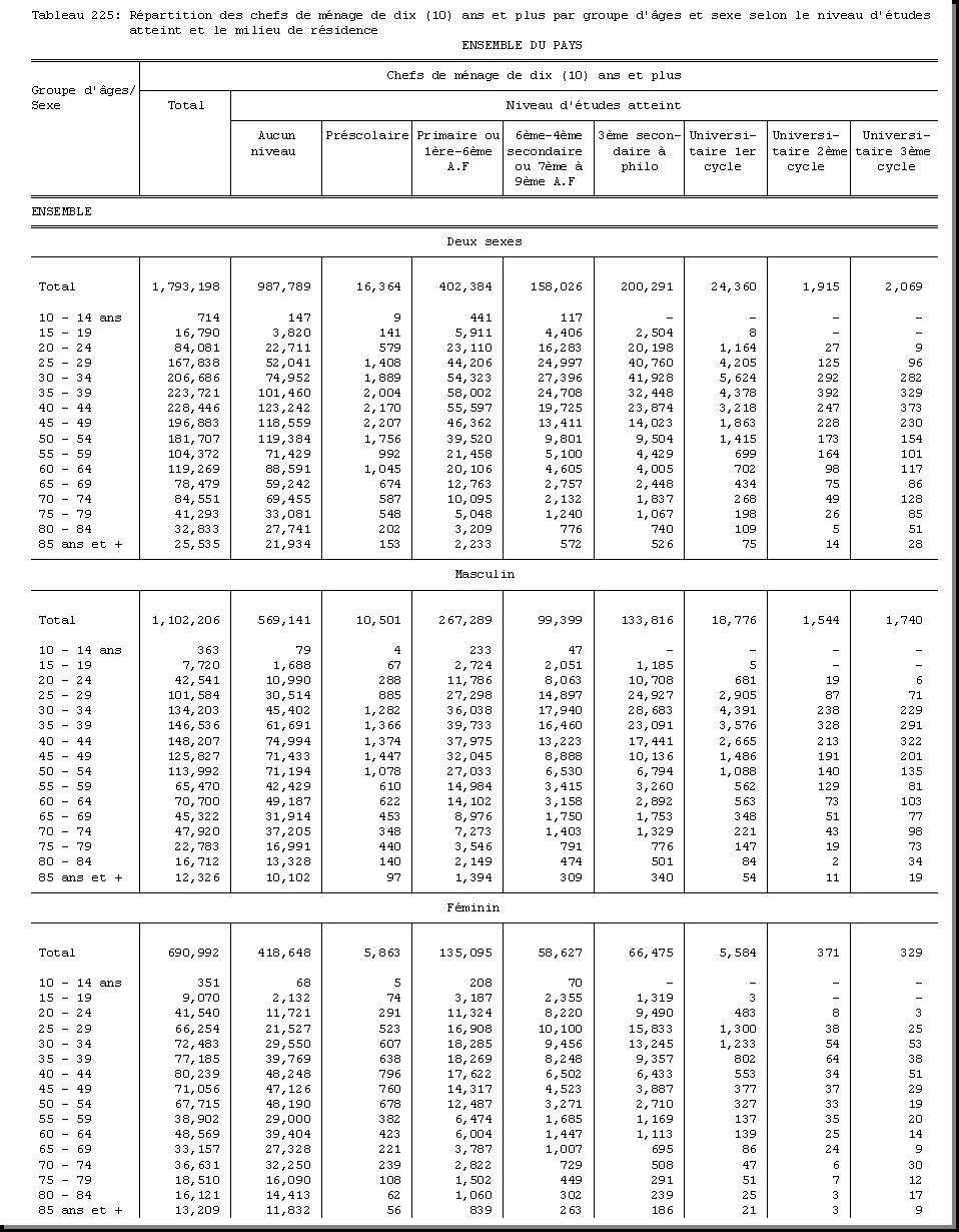 TAB-225 : REPARTITION DES CHEFS DE MENAGE DE DIX (10) ANS ET PLUS PAR GROUPE D'AGES ET SEXE SELON LE NIVEAU D'ETUDES ATTEINT ET LE MILIEU DE RESIDENCE |