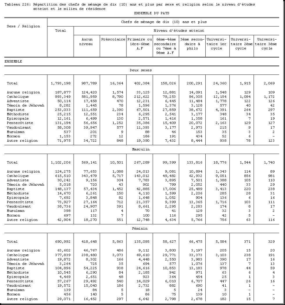 TAB-226 : REPARTITION DES CHEFS DE MENAGE DE DIX (10) ANS ET PLUS PAR SEXE ET RELIGION SELON LE NIVEAU D'ETUDES ATTEINT ET LE MILIEU DE RESIDENCE |