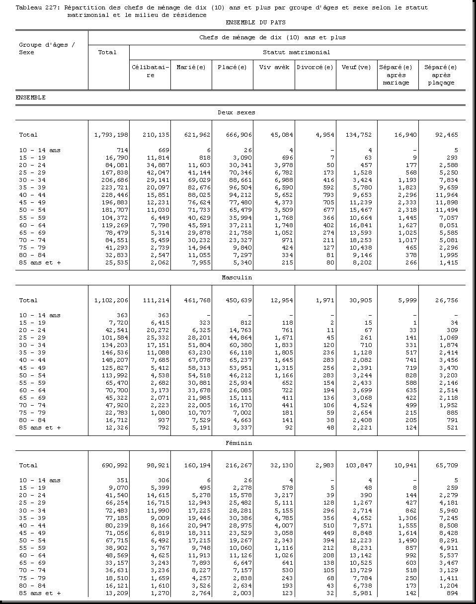 TAB-227 : REPARTITION DES CHEFS DE MENAGE DE DIX (10) ANS ET PLUS PAR GROUPE D'AGES ET SEXE SELON LE STATUT MATRIMONIAL ET LE MILIEU DE RESIDENCE |