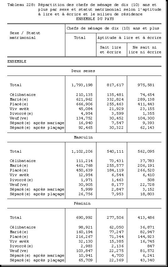 TAB-228 : REPARTITION DES CHEFS DE MENAGE DE DIX (10) ANS ET PLUS PAR SEXE ET STATUT MATRIMONIAL SELON L'APTITUDE A LIRE ET A ECRIRE ET LE MILIEU DE RESIDENCE |