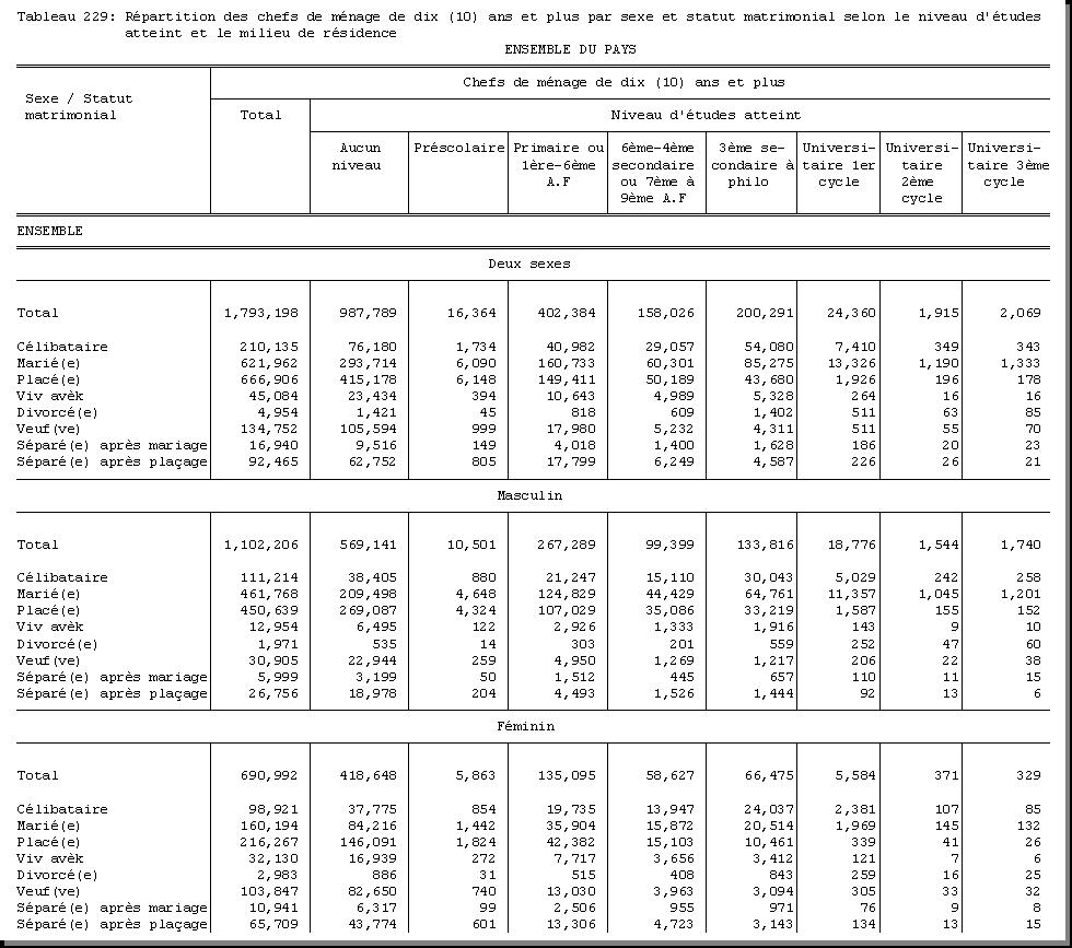 TAB-229 : REPARTITION DES CHEFS DE MENAGE DE DIX (10) ANS ET PLUS PAR SEXE ET STATUT MATRIMONIAL SELON LE NIVEAU D'ETUDES ATTEINT ET LE MILIEU DE RESIDENCE |