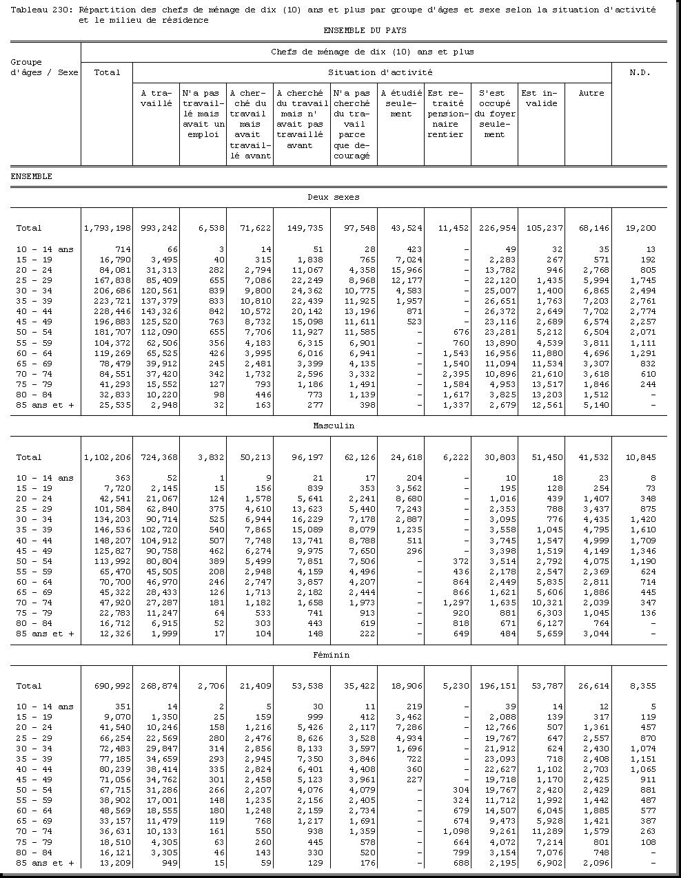 TAB-230 : REPARTITION DES CHEFS DE MENAGE DE DIX (10) ANS ET PLUS PAR GROUPE D'AGES ET SEXE SELON LA SITUATION D'ACTIVITE ET LE MILIEU DE RESIDENCE |