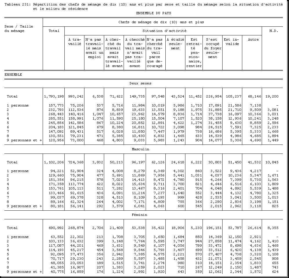 TAB-231 : REPARTITION DES CHEFS DE MENAGE DE DIX (10) ANS ET PLUS PAR SEXE ET TAILLE DU MENAGE SELON LA SITUATION D'ACTIVITE ET LE MILIEU DE RESIDENCE |