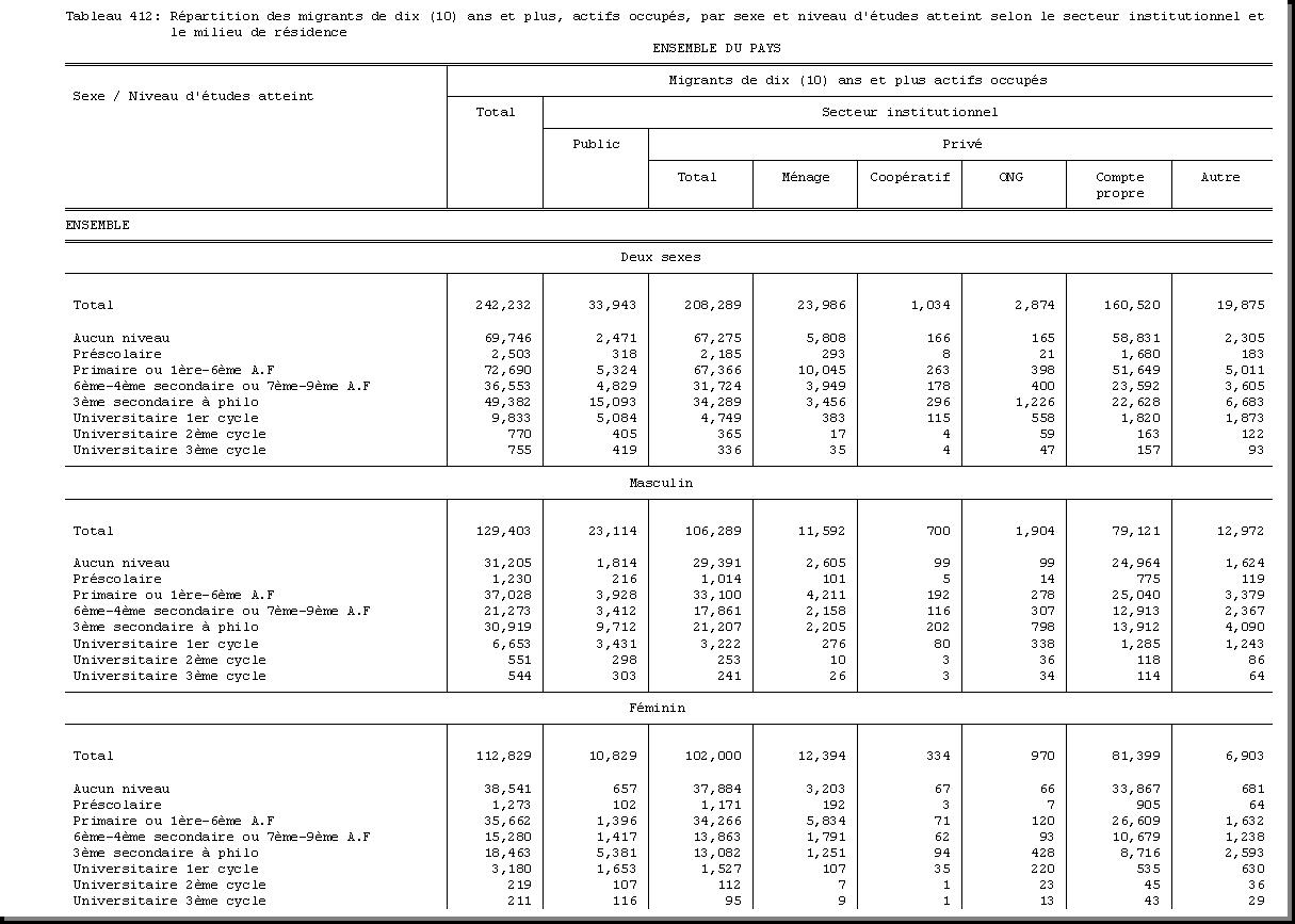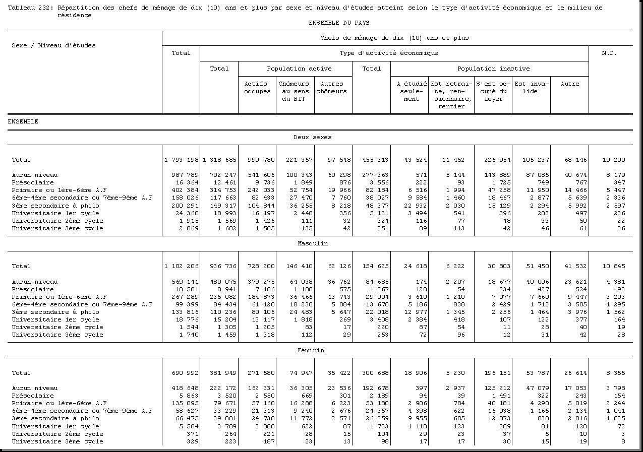 TAB-232 : REPARTITION DES CHEFS DE MENAGE DE DIX (10) ANS ET PLUS PAR SEXE ET NIVEAU D'ETUDES ATTEINT SELON LE TYPE D'ACTIVITE ECONOMIQUE ET LE MILIEU DE RESIDENCE |