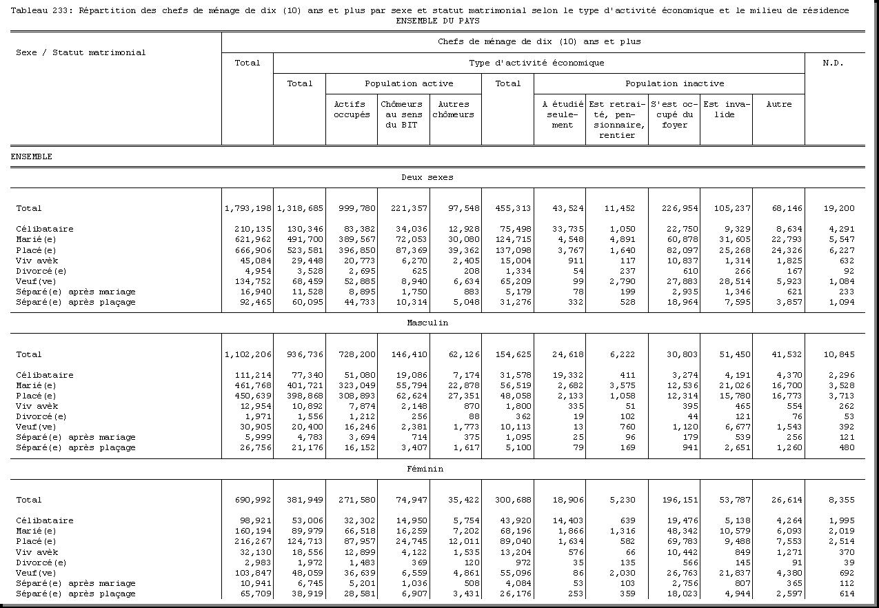 TAB-233 : REPARTITION DES CHEFS DE MENAGE DE DIX (10) ANS ET PLUS PAR SEXE ET STATUT MATRIMONIAL SELON LE TYPE D'ACTIVITE ECONOMIQUE ET LE MILIEU DE RESIDENCE |