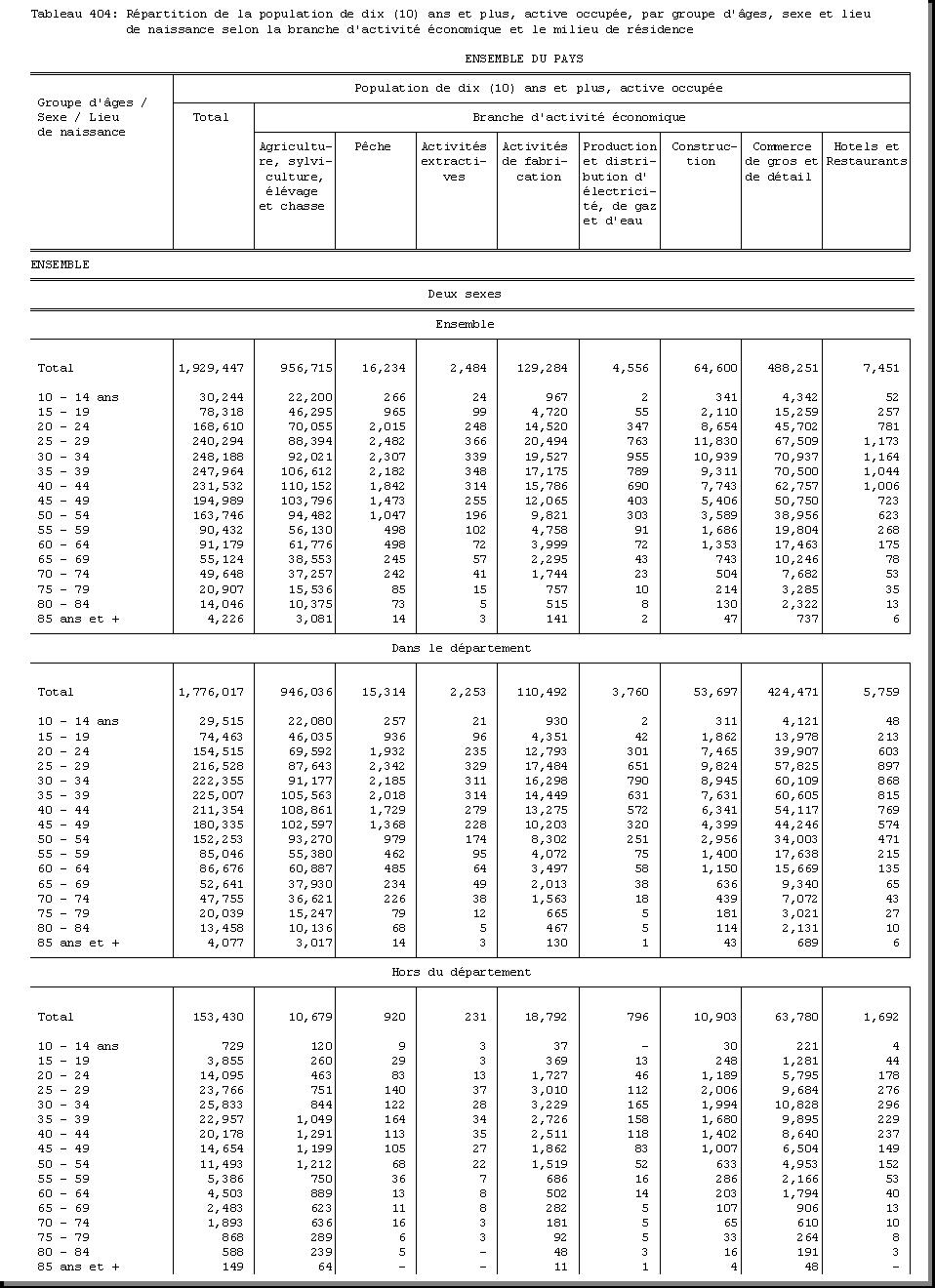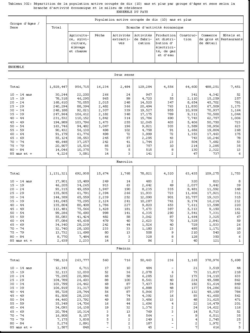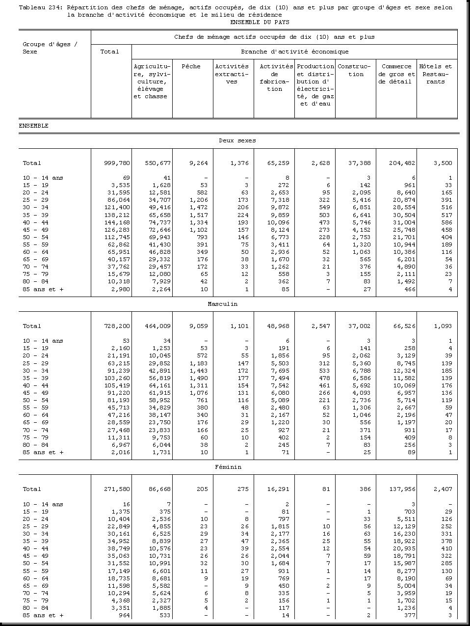 TAB-234 : REPARTITION DES CHEFS DE MENAGE, ACTIFS OCCUPES, DE DIX (10) ANS ET PLUS PAR GROUPE D'AGES ET SEXE SELON LA BRANCHE D'ACTIVITE ECONOMIQUE ET LE MILIEU DE RESIDENCE |