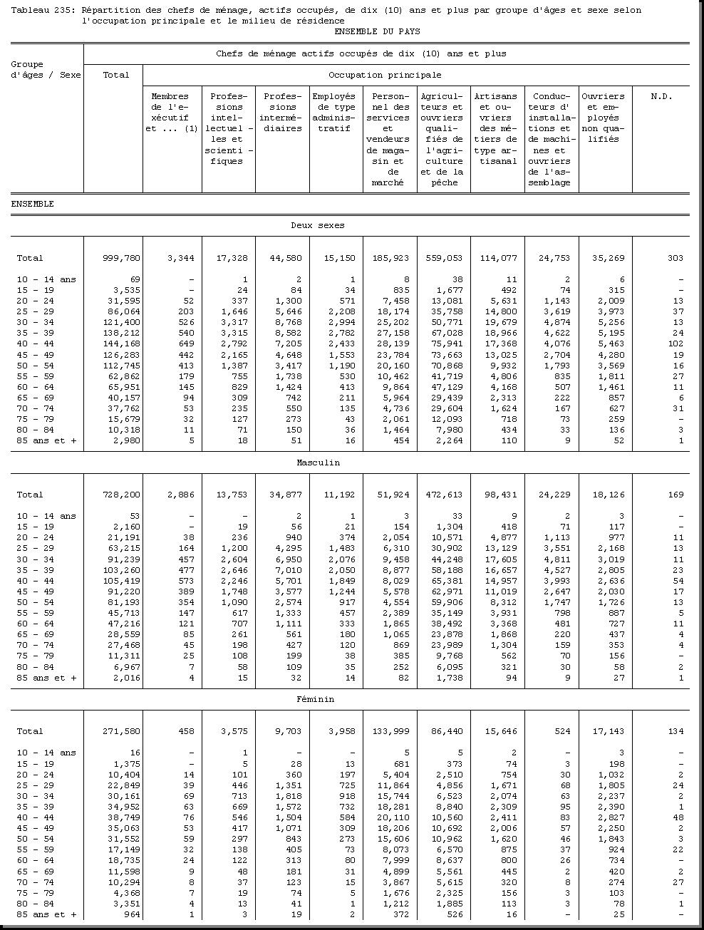 TAB-235 : REPARTITION DES CHEFS DE MENAGE, ACTIFS OCCUPES, DE DIX (10) ANS ET PLUS PAR GROUPE D'AGES ET SEXE SELON L'OCCUPATION PRINCIPALE ET LE MILIEU DE RESIDENCE |