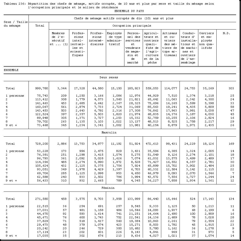 TAB-236 : REPARTITION DES CHEFS DE MENAGE, ACTIFS OCCUPES, DE DIX (10) ANS ET PLUS PAR SEXE ET TAILLE DU MENAGE SELON L'OCCUPATION PRINCIPALE ET LE MILIEU DE RESIDENCE |