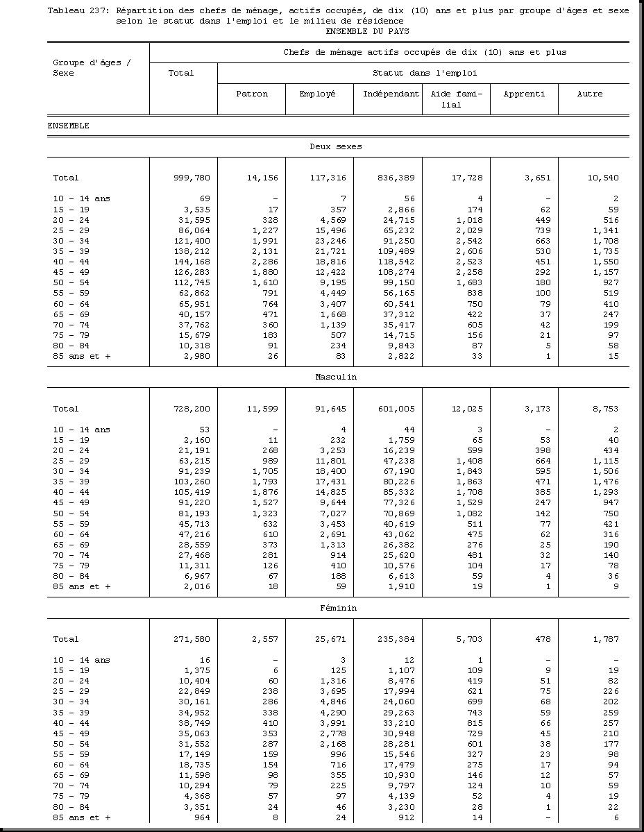 TAB-237 : REPARTITION DES CHEFS DE MENAGE, ACTIFS OCCUPES, DE DIX (10) ANS ET PLUS PAR GROUPE D'AGES ET SEXE SELON LE STATUT DANS L'EMPLOI ET LE MILIEU DE RESIDENCE |