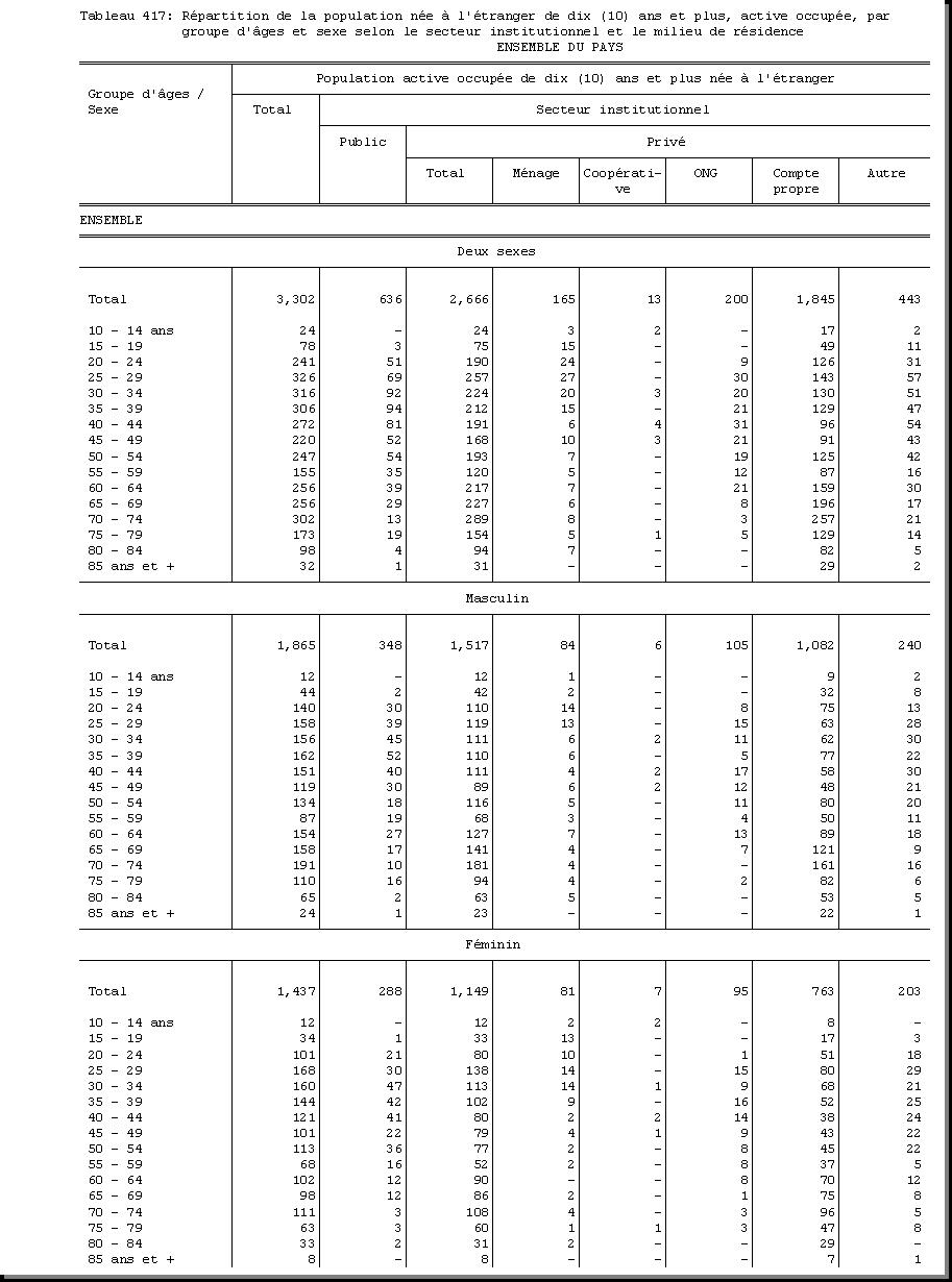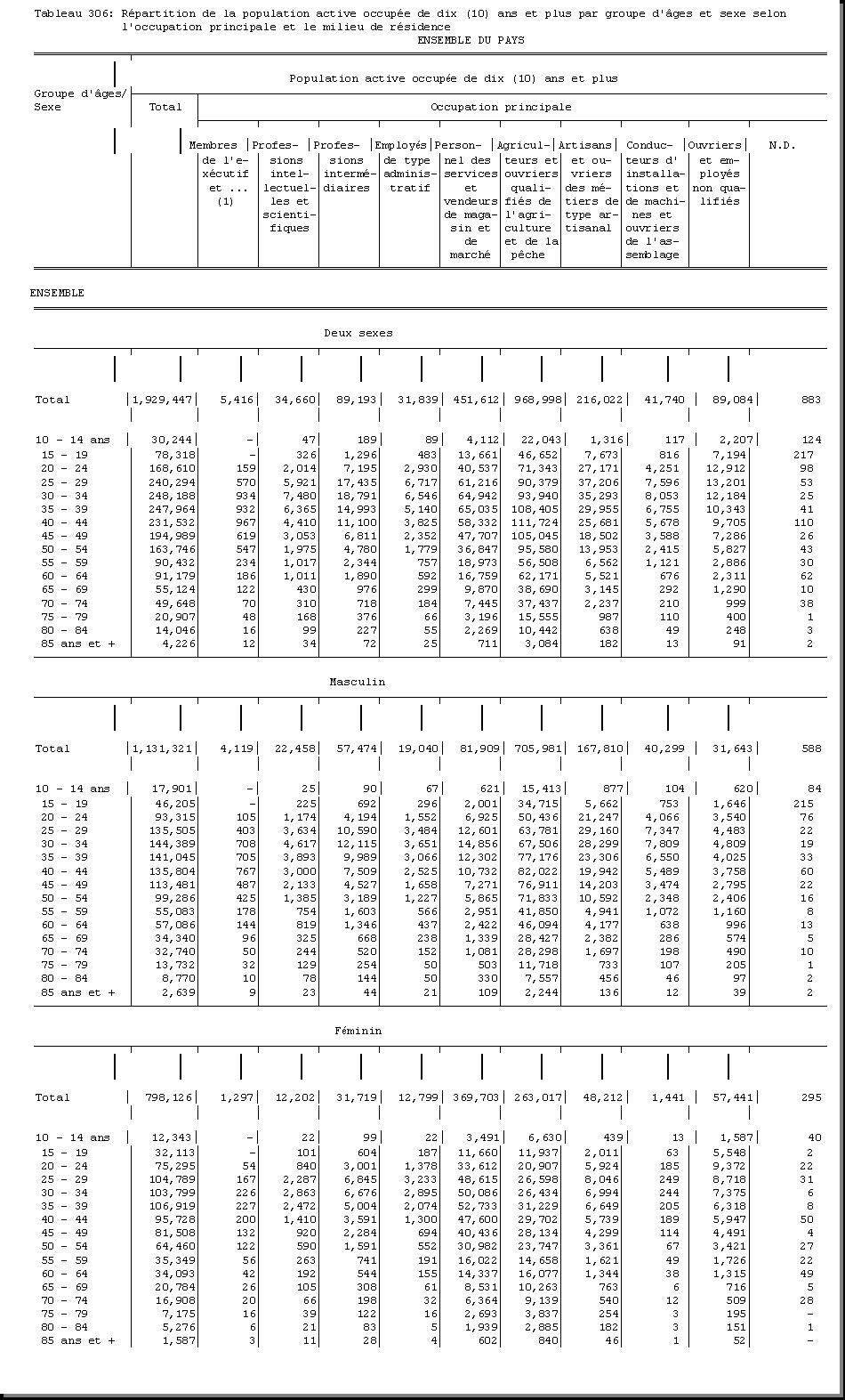 AGE : F1.5, SEXE : F1.4, CHEF DE MENAGE : F1.3.1 OCCUPATION PRINCIPALE : F3.25, POPULATION ACTIVE OCCUPEE : F3.22.1/F3.22.2, MILIEU DE RESIDENCE : A4 |
