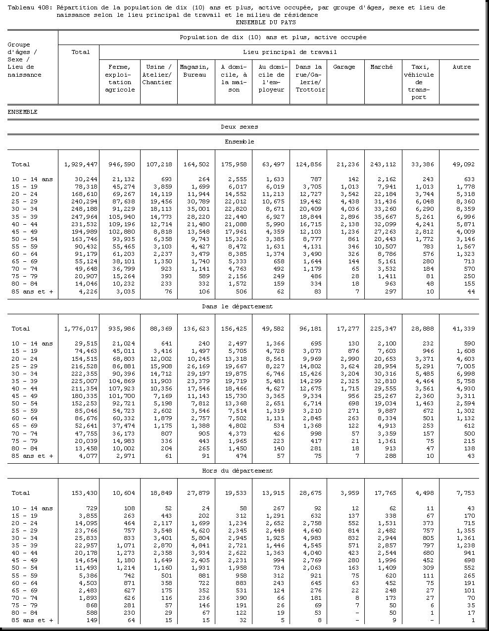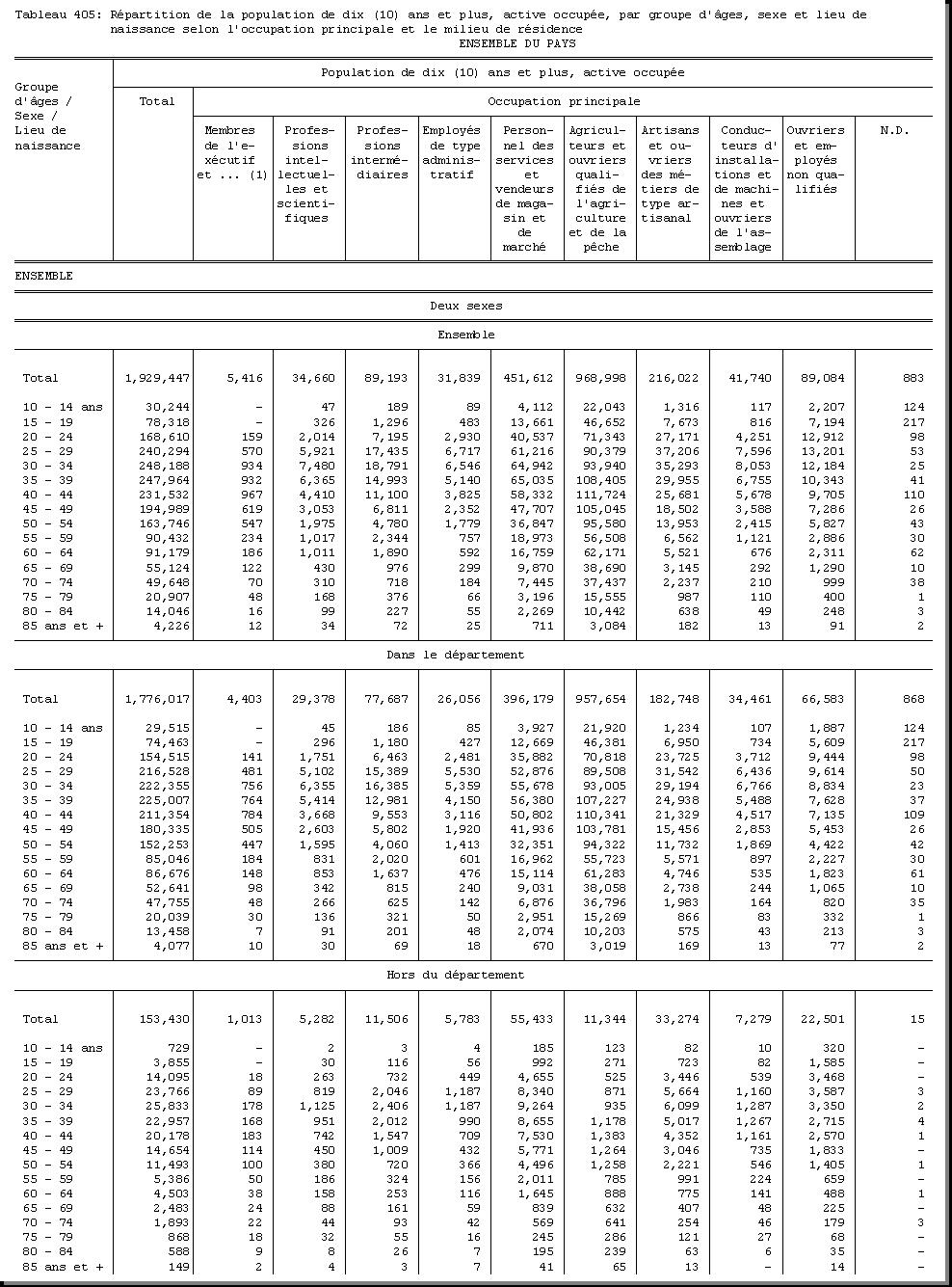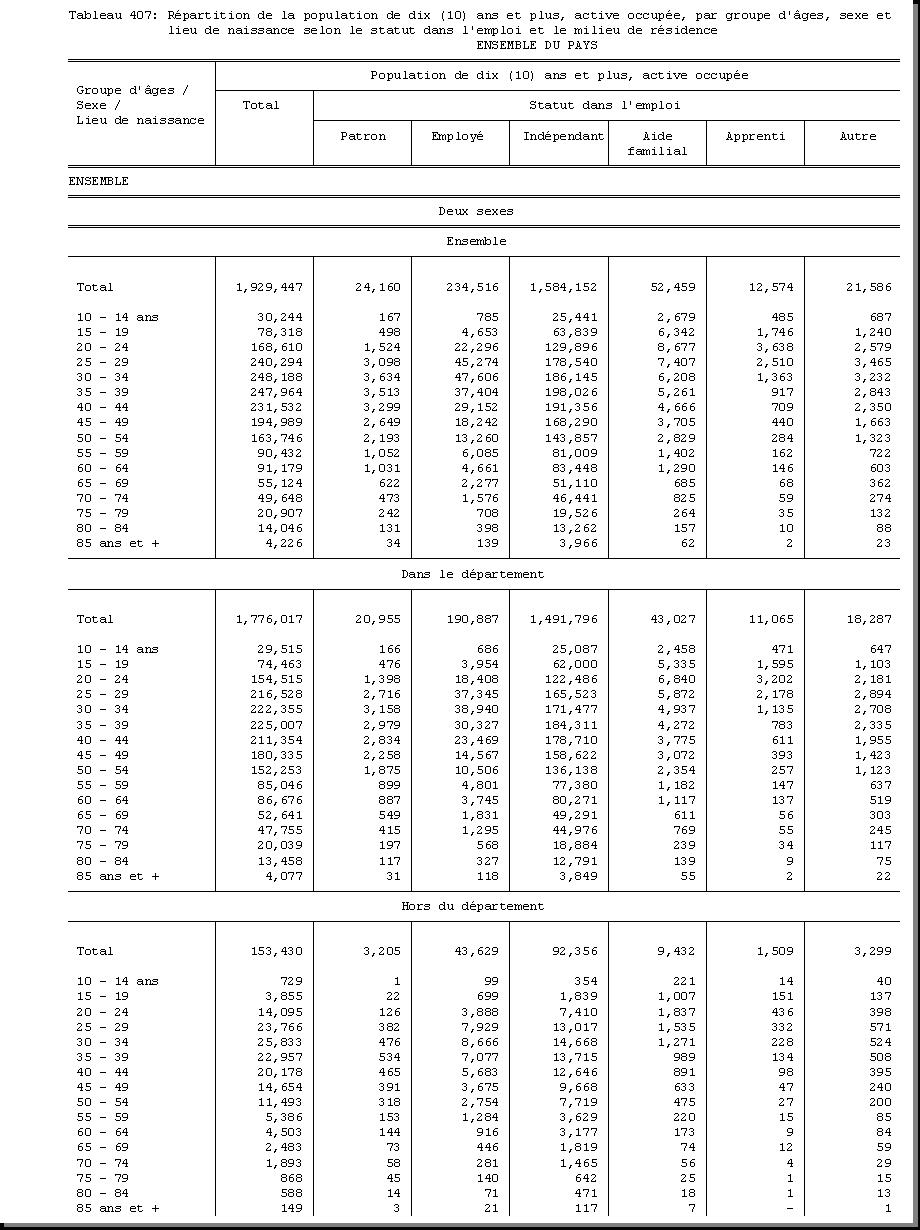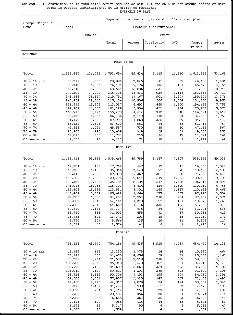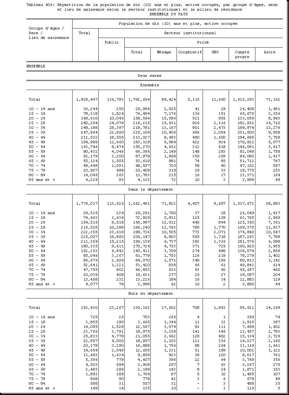 AGE : F1.5, SEXE : F1.4, CHEF DE MENAGE : F1.3.1, POPULATION ACTIVE OCCUPEE : F3.22.1/F3.22.2, BRANCHE D'ACTIVITE ECONOMIQUE : F3.24, MILIEU DE RESIDENCE : A4 |