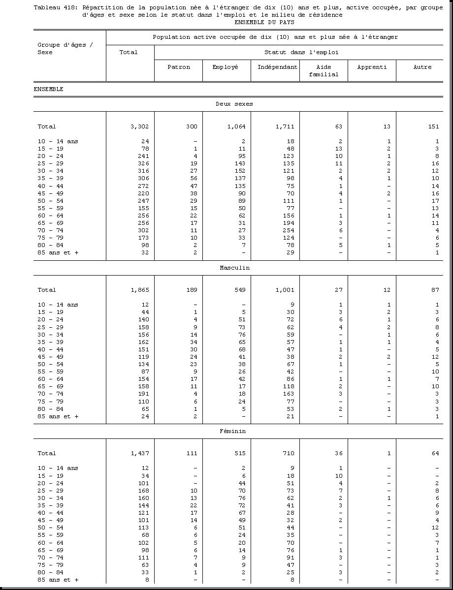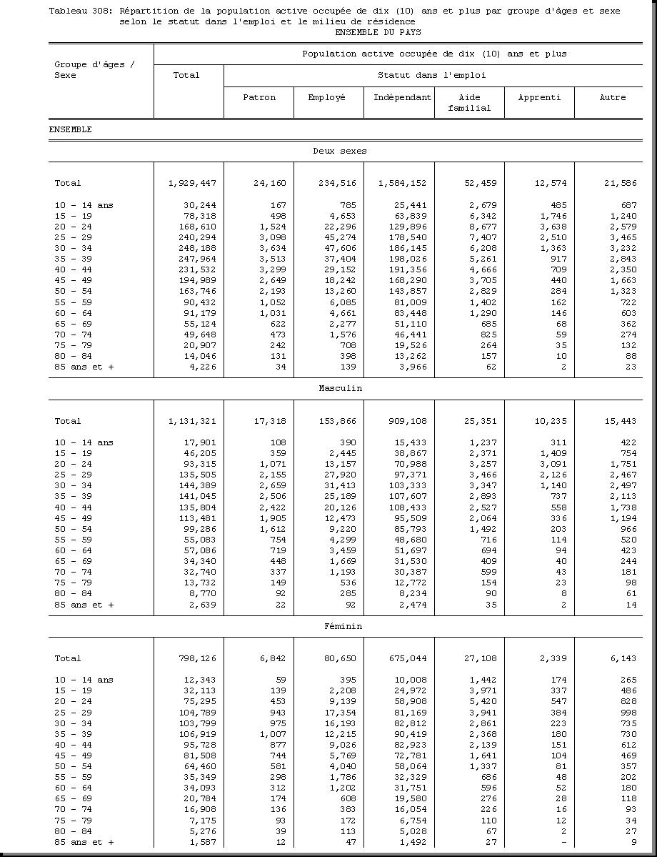 AGE : F1.5, SEXE : F1.4, CHEF DE MENAGE : F1.3.1, STATUT DANS L'EMPLOI : F3.27, POPULATION ACTIVE OCCUPEE : F3.22.1/F3.22.2, MILIEU DE RESIDENCE : A4 |