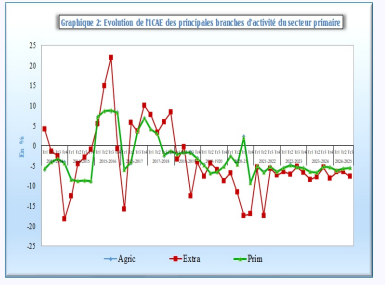 L'ICAE du Secteur Primaire a chuté, en e glissement annuel, de 5.5% au 3 trimestre de l'exercice fiscal 2024-2025, ce qui correspond e à une décroissance cumulée (d'octobre à juin) de 5.7 %. Cette évolution négative du secteur primaire au 3 trimestre est consécutive à la baisse de ses deux sous-branches, en l'occurrence la branche agricole et les activités extractives..