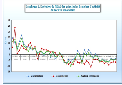 Comparé au troisième trimestre de l'exercice fiscal 2023-2024, où le taux de croissance était de -5,8%, l'ICAE du secteur secondaire a enregistré une régression de plus de 4,0% (-4,3%) au cours du troisième trimestre de l'année fiscale 2024-2025. Ce résultat négatif s'explique par la contraction de l'ensemble des composantes de ce secteur. Il en résulte une variation cumulative négative d'octobre à juin 2025 de 4,4%, un peu moins élevée que la chute de 5,2% enregistrée à la même période de l'année dernière.