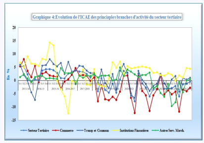 Tout comme les deux autres secteurs, le secteur tertiaire a aussi connu une décroissance au cours du 3è trimestre, mais relativement moins marquée. En effet, son ICAE a enregistré un léger recul annuel de 0,4%, nettement inférieur à la contraction de 1,7%, de la même période de l'année précédente. Parmi les composantes du secteur, les branches des Institutions Financières, des Télécommunications et des Services Non Marchands ont affiché des tendances haussières. En valeur cumulative, l'ICAE du secteur tertiaire a diminué de 1,1% sur les trois trimestres de l'exercice fiscal 2024-2025.